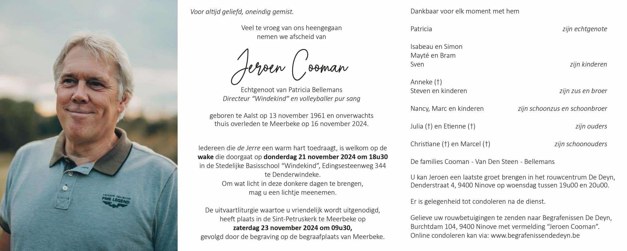 Jeroen was deze week op 13 november 63 jaar geworden; hij is zaterdag 16 november thuis plots overleden.
