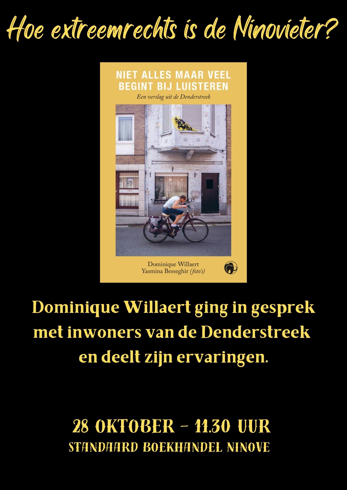 - Zaterdag 28 oktober komt Dominique Willaert om 11.30 uur praten over zijn boek ‘Niet alles maar veel begint bij luisteren: een verslag uit de Denderstreek’.