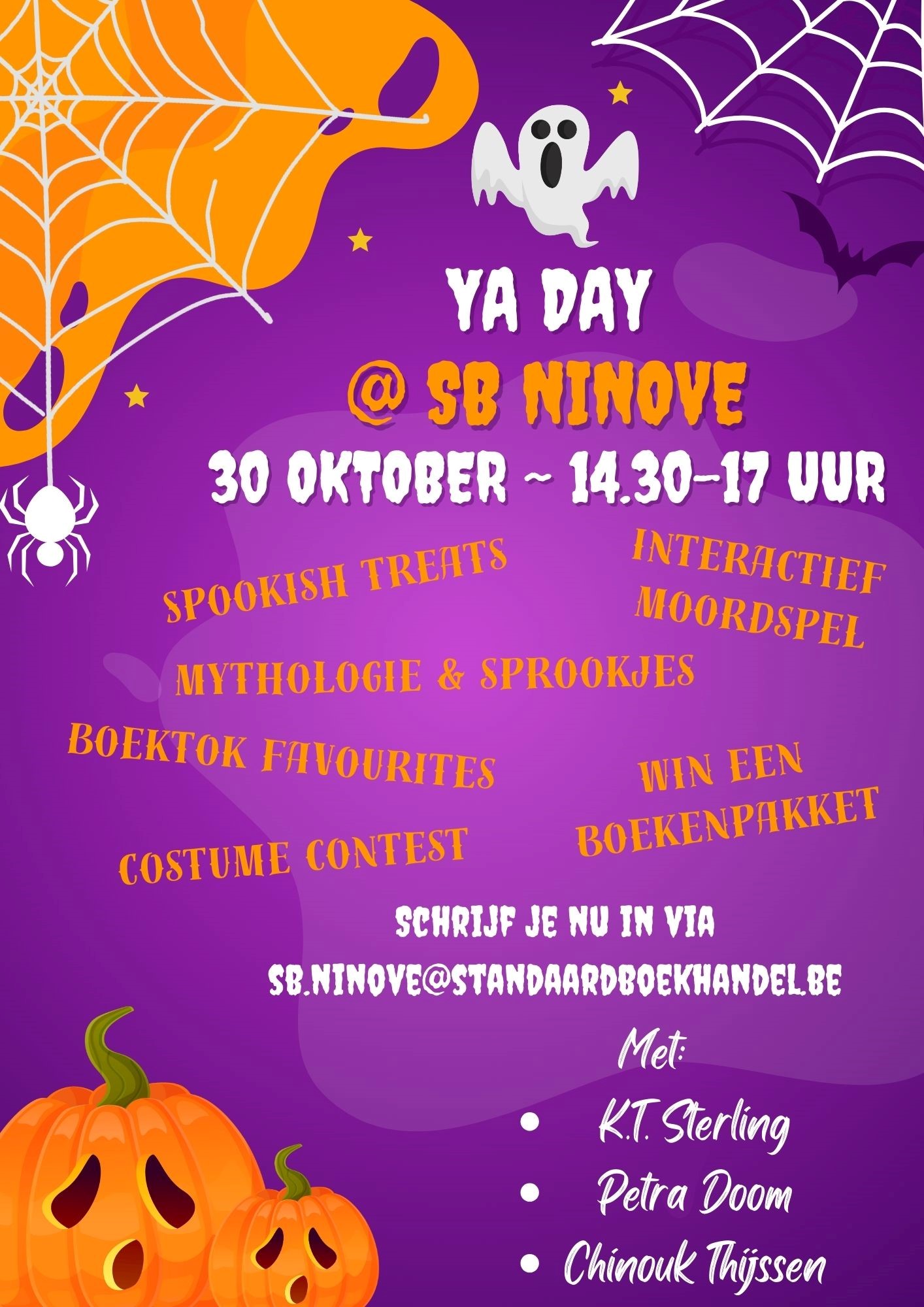 - Maandag 30 oktober: YA-day, van 14.30 tot 17.00 uur, specifiek gericht naar tieners. Ze verkennen de mythologie en sprookjes met auteurs Petra Doom en K.T. Sterling, nemen deel aan een interactief moordspel met auteur Chinouk Thijssen en kunnen een Halloweenraadsel oplossen om een gesigneerd boekenpakket te winnen. Als je in een leuk griezelkostuum opdaagt, kan je een boekenbon ter waarde van € 30 winnen.