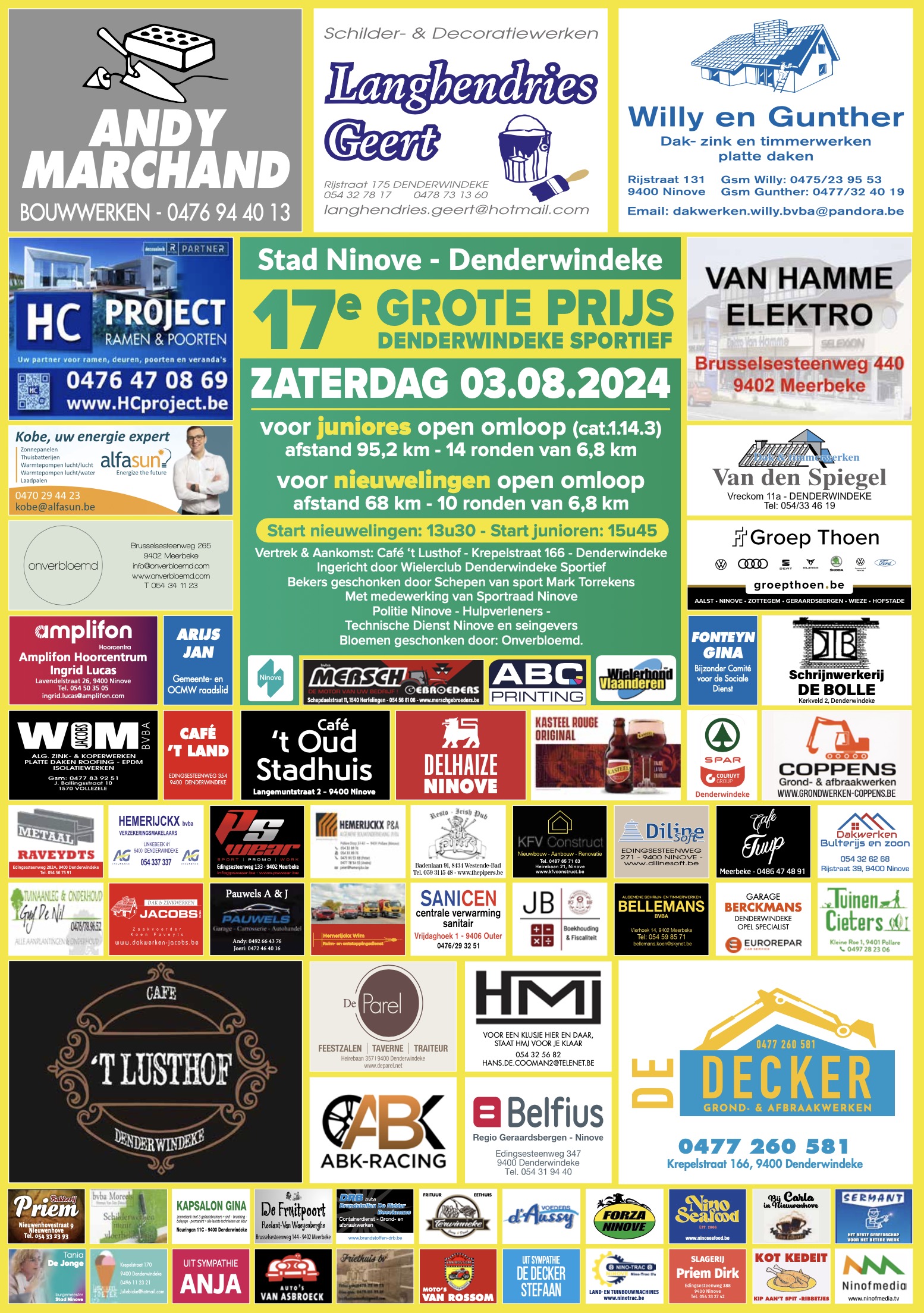 DENDERWINDEKE – Denderwindeke Sportief organiseert zaterdag 3 augustus een wielerwedstrijd voor nieuwelingen en junioren.