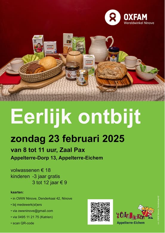 APPELTERRE-EICHEM – De Ninoofse Oxfam Wereldwinkel organiseert zondag 23 februari een (h)eerlijk ontbijt in zaal Pax.