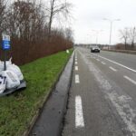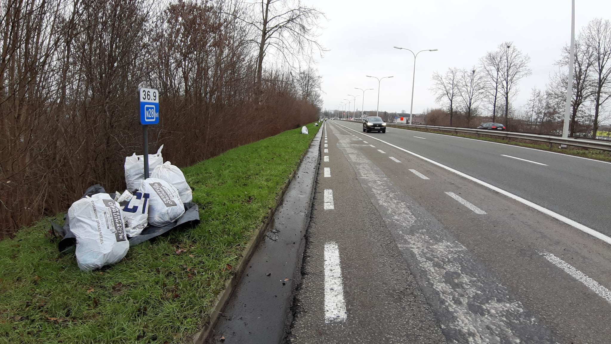 De ‘buit’ oogt indrukwekkend: 54 witte zwerfvuilzakken en 28 sluikstortzakken, die ze uit de berm van de Koning Boudewijnlaan naar boven hebben gesleurd.