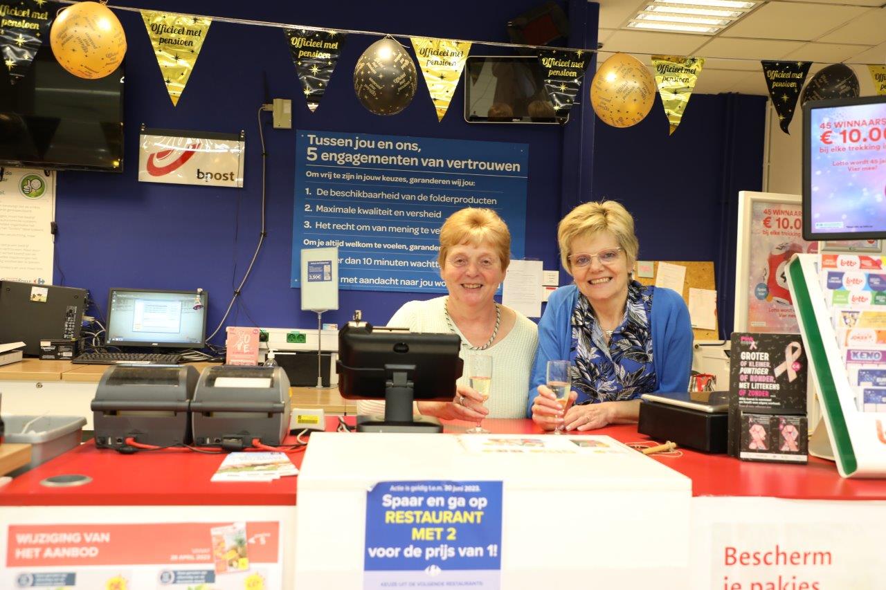 Carine De Smet (44 jaar dienst) en Brigitte De Munck (45 jaar dienst) namen afscheid van de klanten en hun collega’s. Ze kunnen voortaan genieten van hun welverdiend pensioen. Daarmee verdwijnen voor de klanten twee vertrouwde gezichten.