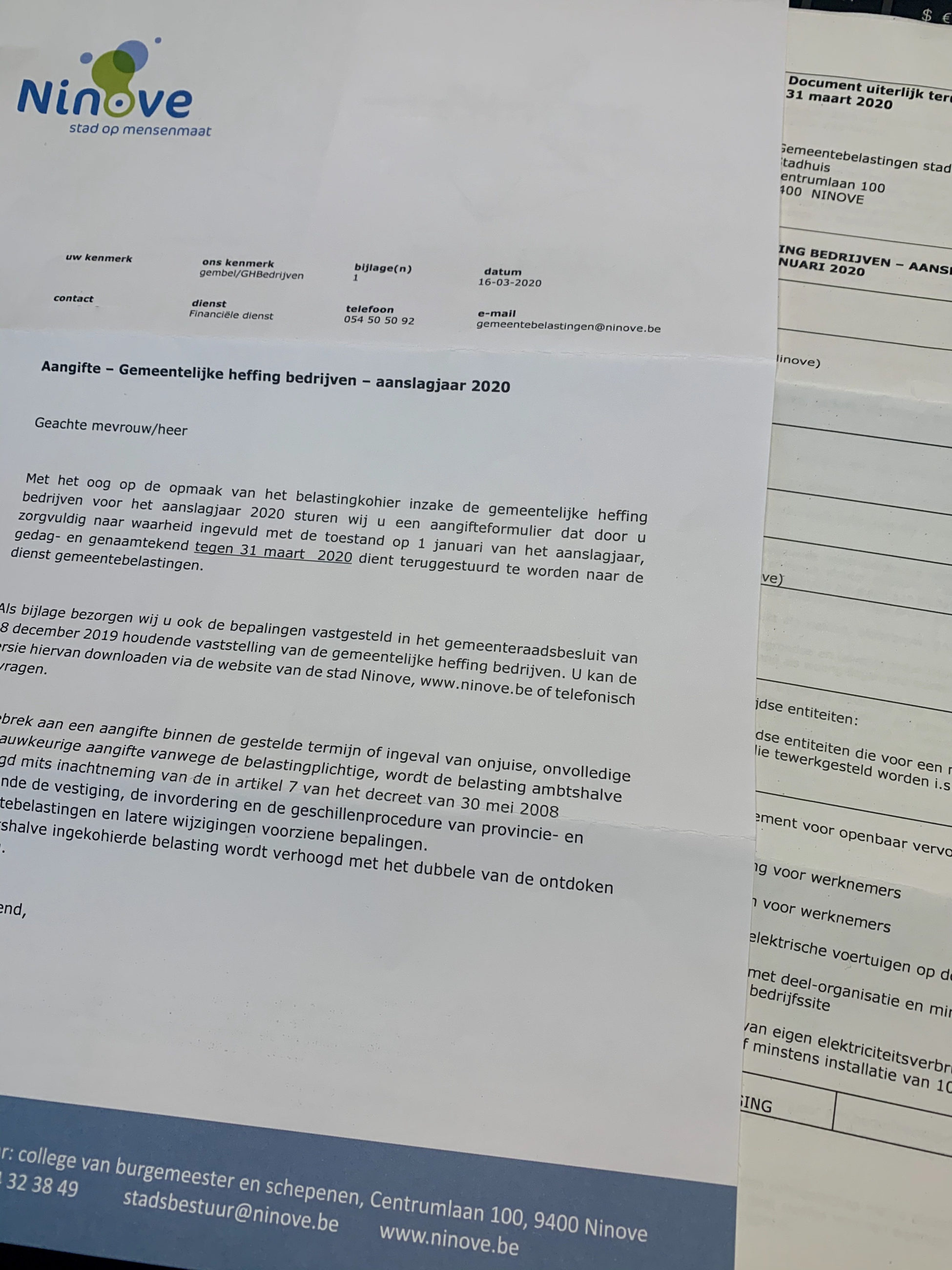 NINOVE – De Ninoofse bedrijven en handelaars ontvingen deze week een aangifteformulier voor de belastingen met een begeleidende brief. De oorspronkelijke uiterste indiendatum van 31 maart vervalt echter omdat het stadsbestuur werkt aan fiscale maatregelen voor bedrijven en handelaars.