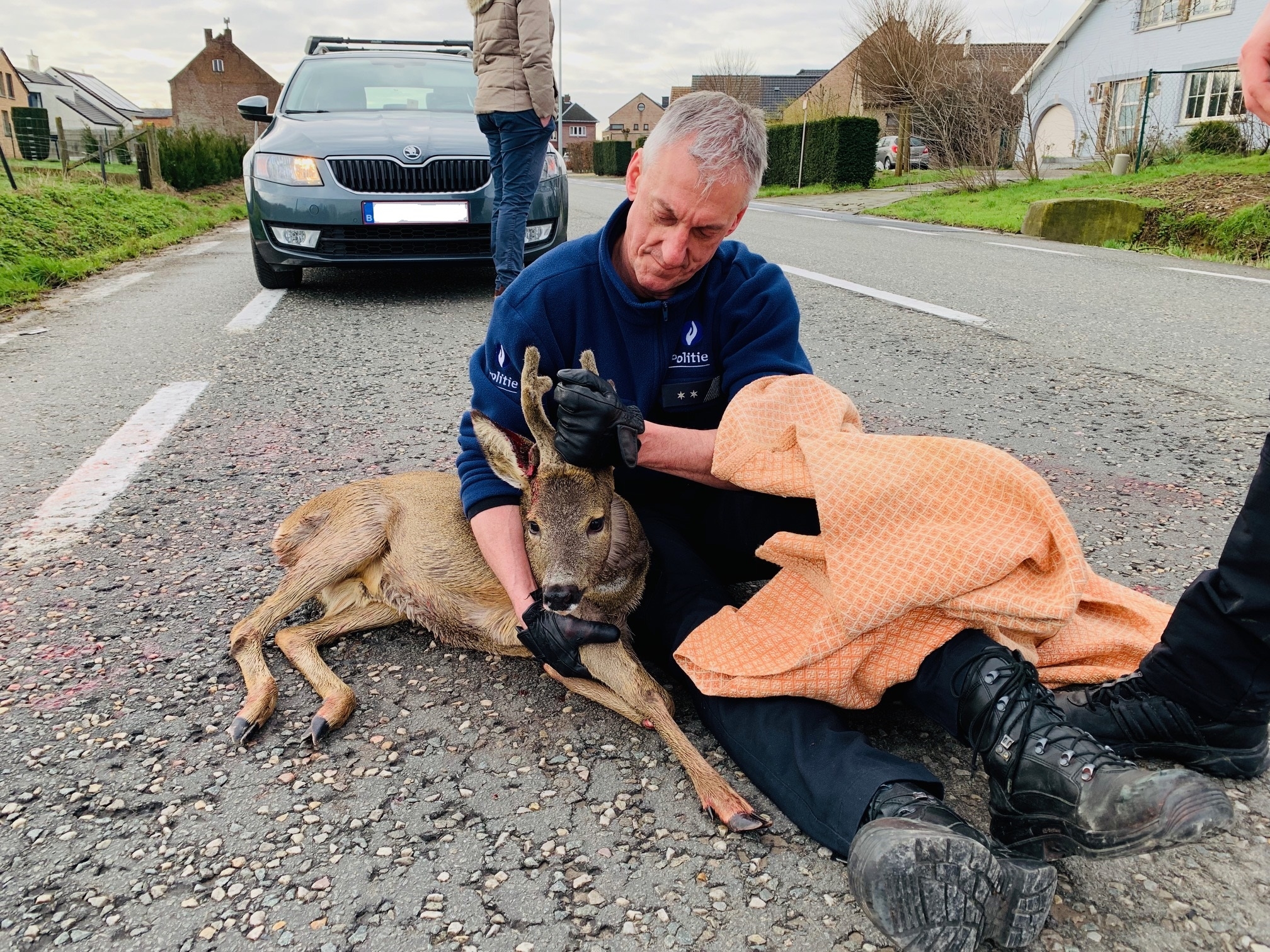 De politie van Ninove ontfermde zich over het zwaargewonde dier. Een agent bracht de eerste zorgen toe en wachtte de komst af van een dierenarts. De schade aan het voertuig was beperkt.