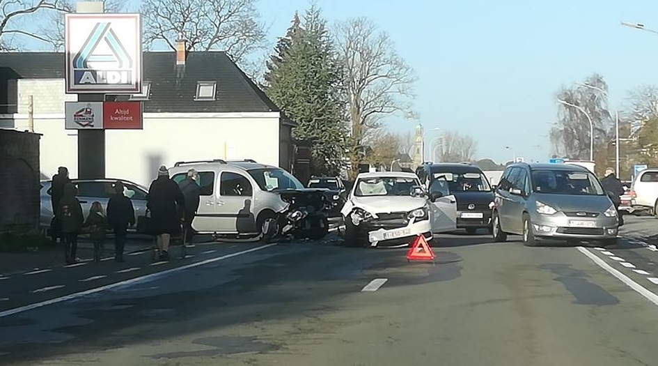 Eén van de auto’s wilde de parking van de Aldi verlaten. Hij kwam in aanrijding met een auto op de Halsesteenweg, die in de richting van Meerbeke reed.
