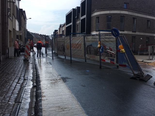 De hevige regenbuien deze namiddag gingen gepaard met heftige windstoten. Ter hoogte van de werken op Preulegem, aan de spoorwegovergang, stond een afrastering met afdekzeilen als vervanging voor het voetpad. Een windvlaag verplaatste de hele afsluiting naar de andere kant van de straat; op dat ogenblik kwam een bromfietser langs gereden. Hij kreeg de afrastering over zich heen en is afgevoerd naar het ziekenhuis.
