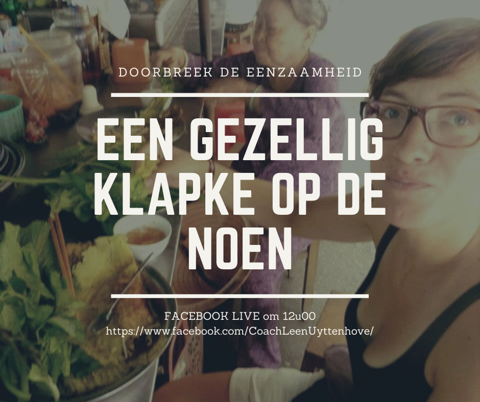 Ze zal dan ook dagelijks om 12 uur een Facebook-live organiseren, iets wat zij omschrijft als ‘een gezellig klapke onder de noen’. De inhoud van deze lives? Dat zal grotendeels afhangen van de input van de mensen, die op dat moment deelnemen. Gezelligheid en een goeie babbel zijn de hoofddoelen. Dit tijdstip heeft zij bewust gekozen, om de dag te breken. Er is verbinding met andere mensen, ze voelen zich minder alleen.