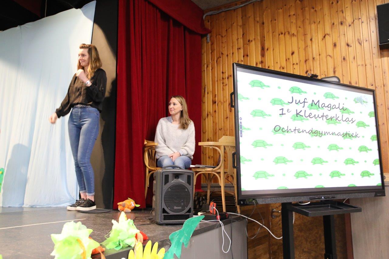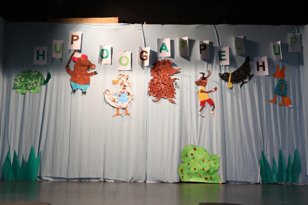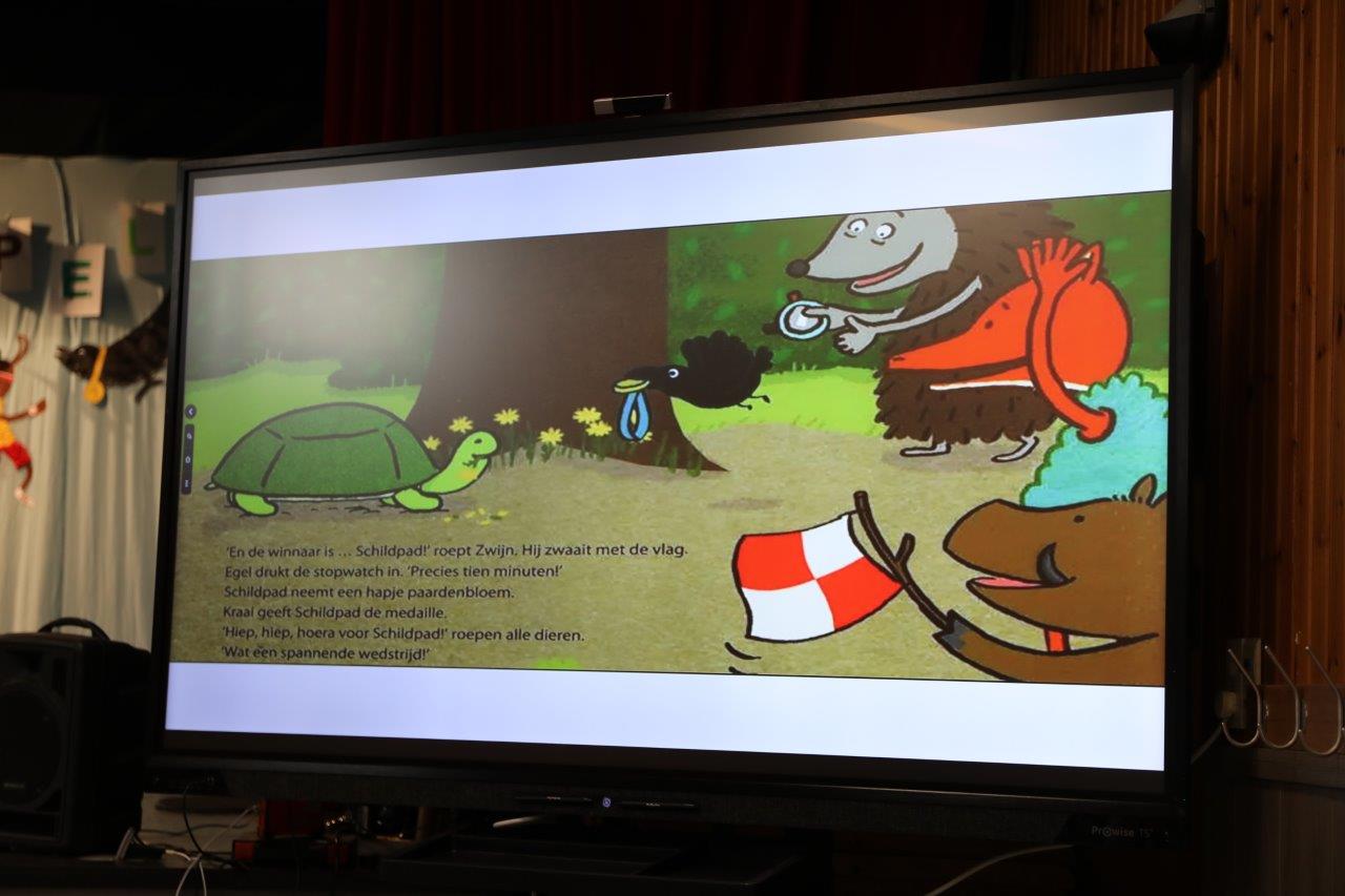 De kleuters en hun leerkrachten bouwden een show op rond de fabel van de schildpad en de haas.