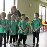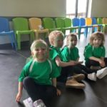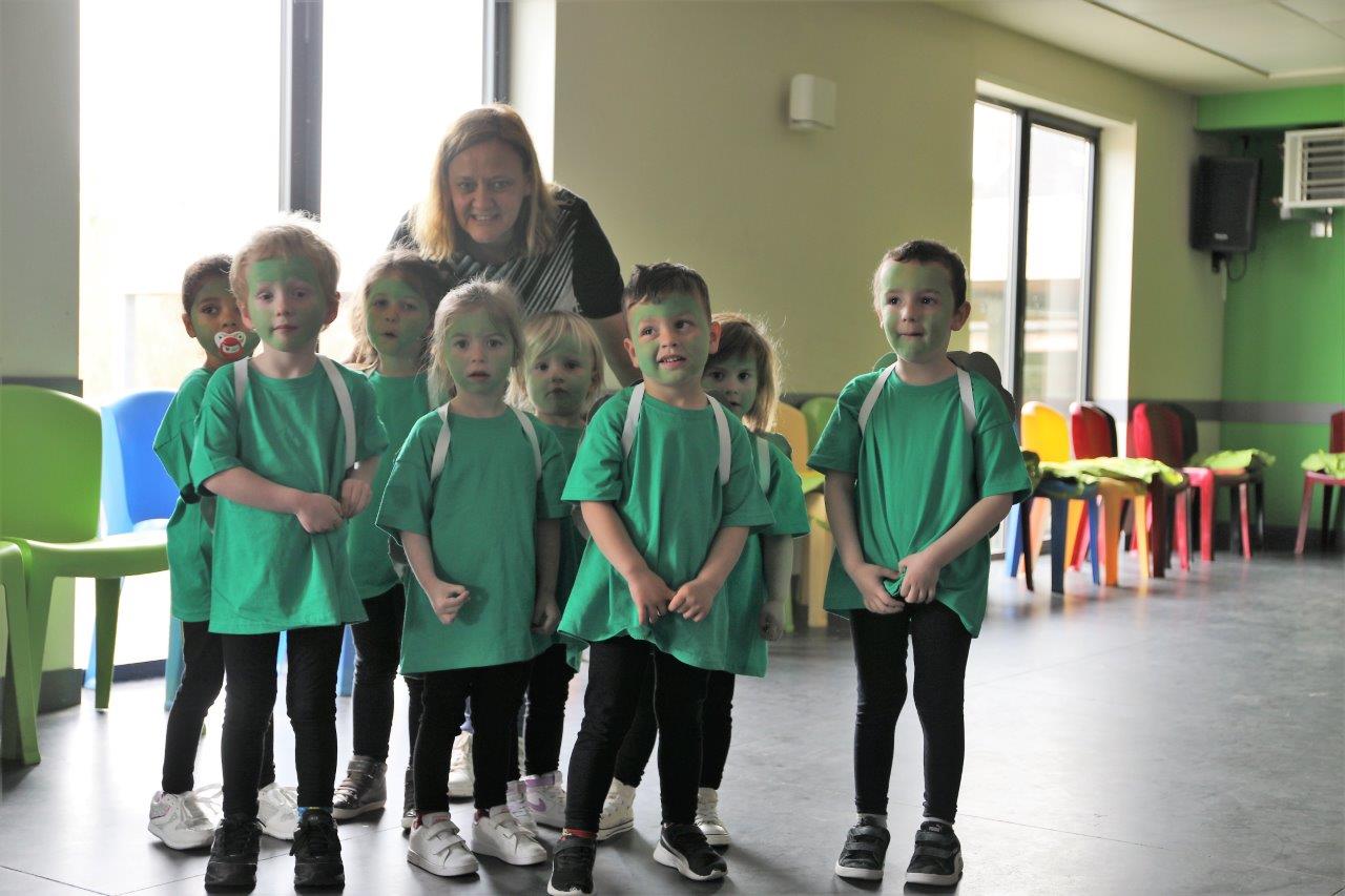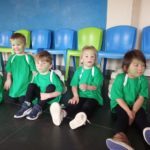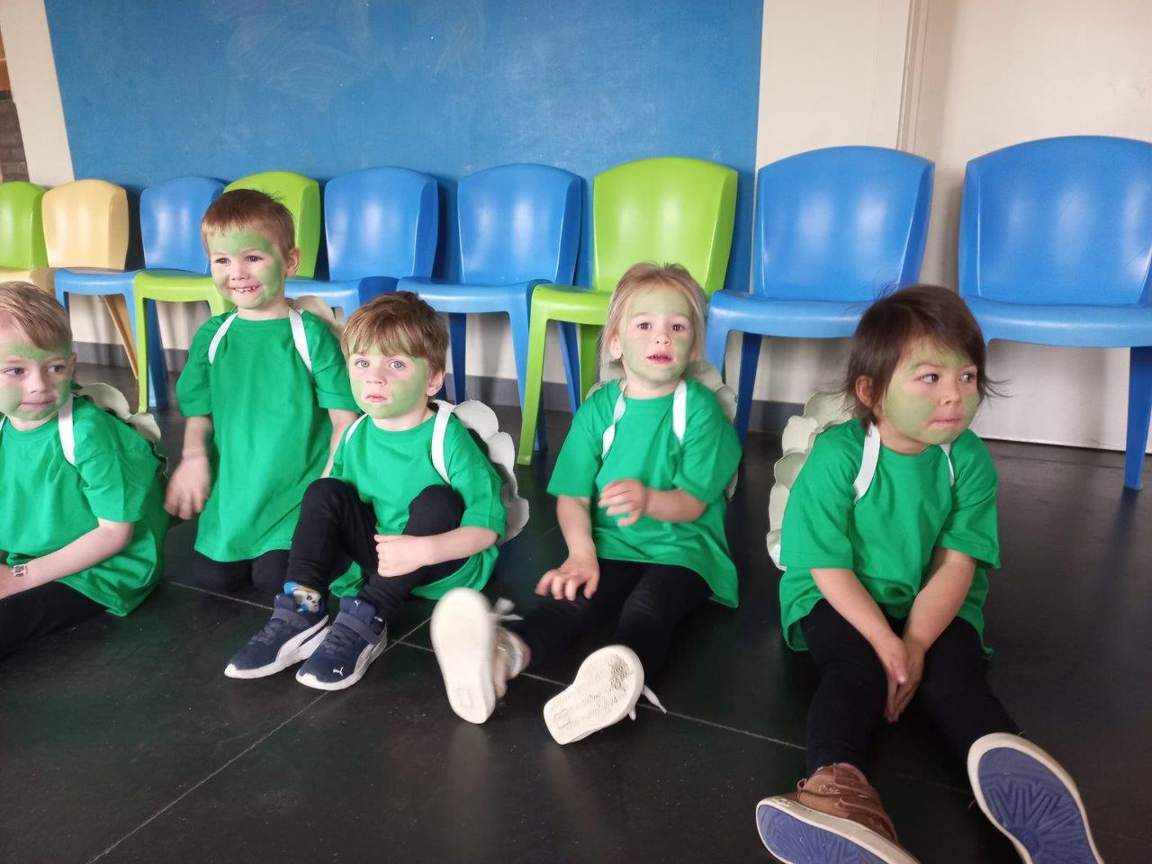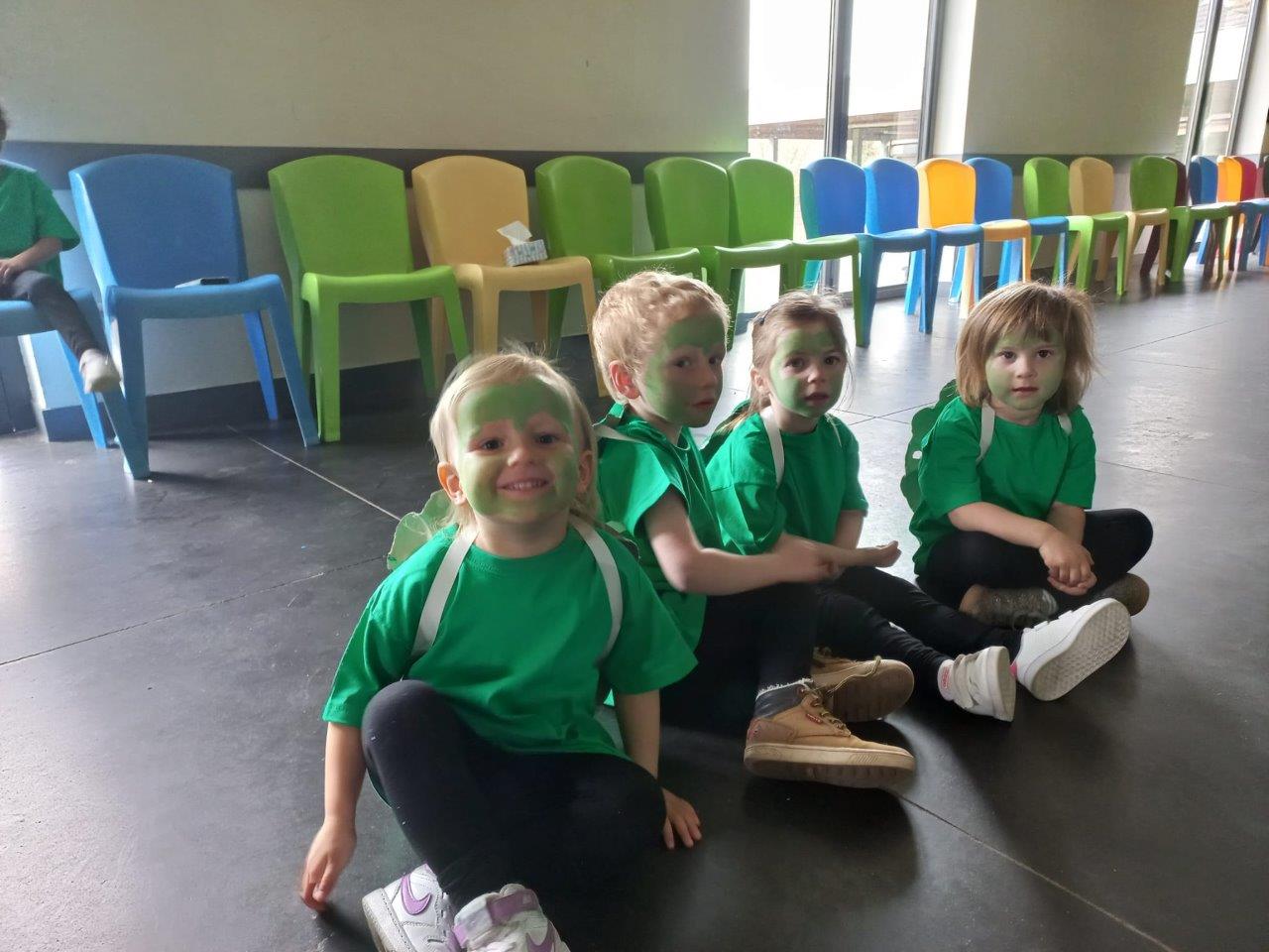 De schilpadden van de eerste kleuterklas deden ochtendgymnastiek. Want goed begonnen, is de wedstrijd al half gewonnen.