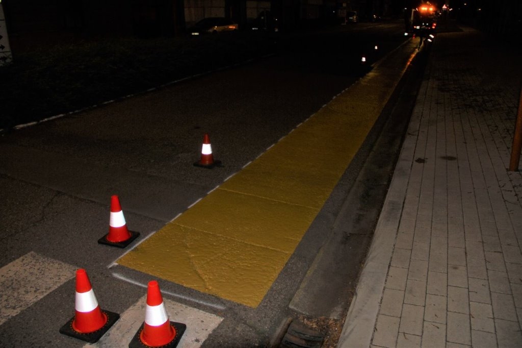 #Ninove – Op zondagavond ging de wegmarkeringsfirma Almaroma in opdracht van de stad in de binnenstad van start met het aanbrengen van fietssuggestiestroken op drukke invalswegen en in schoolomgevingen. De werkzaamheden startten in de Parklaan en Brusselstraat, de volgende nachten zullen verschillende andere straten volgen, de werken worden uitgevoerd bij droog weer tussen 19 u en 06 u. Ondanks een parkeerverbod dat reeds op vrijdag werd geplaatst stonden verschillende wagens geparkeerd in de Brusselstraat wat de werkzaamheden bemoeilijkten. De fietssuggestiestroken hebben een gele kleur, wagens mogen over een fietssuggestiestrook rijden, ze hebben enkel tot doel de aandacht te versterken op het fietsverkeer en aldus een veiligere toestand te creëren. (GNE) Foto’s Giovanni Neckebroeck