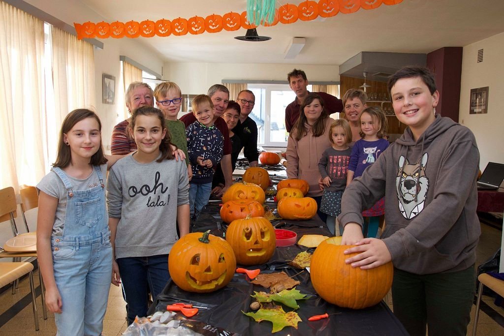 Meerbeke- In Meerbeke staan de prachtige Halloweenpompoenen klaar. Het resultaat van een activiteit van de KWB Meerbeke, waaraan een tiental kinderen met hun (groot)ouders deelnamen. “Vooral de pompoen helemaal uithollen was best wel wat werk. De gezichtjes maken het leukst”, lachte Margot.