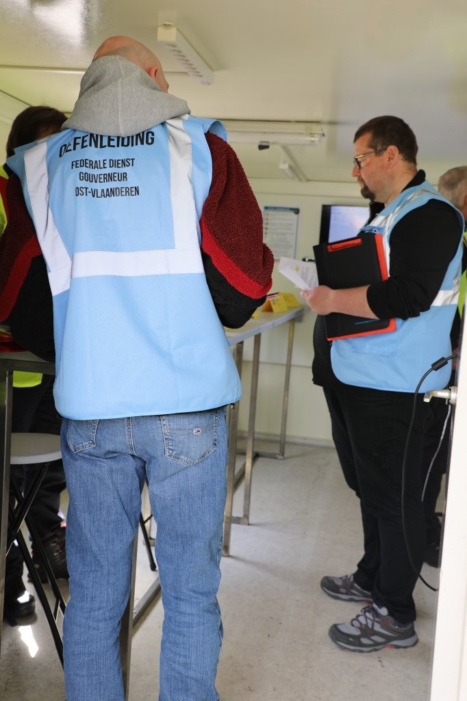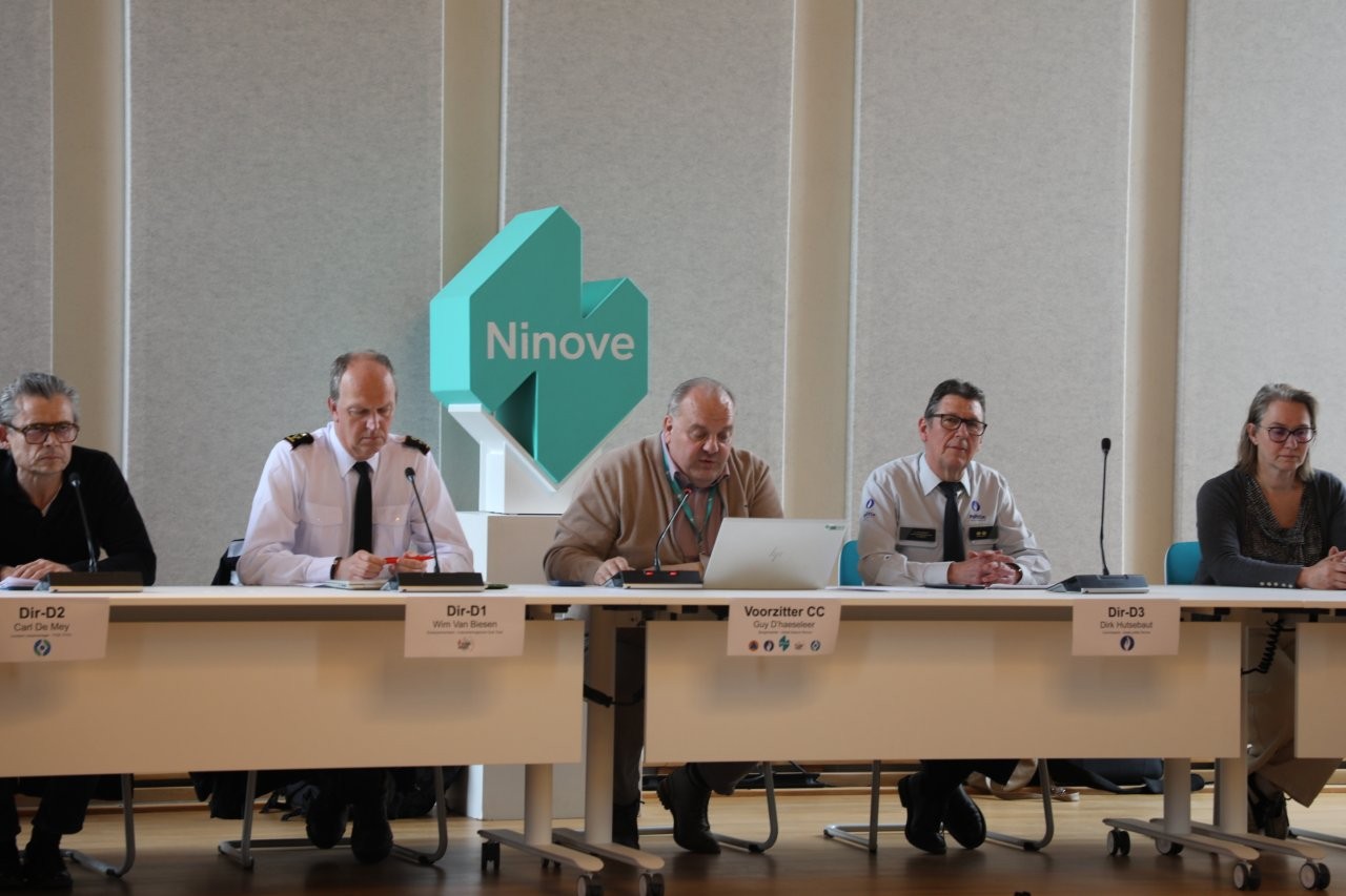 Na afloop van de zenuwslopende en zware dag, kwamen alle verantwoordelijken samen in het stadhuis aan de Centrumlaan voor een eerste korte briefing. Ook burgemeester Guy D’haeseleer was onder de indruk van deze noodplanningsoefening, die duidelijk haar nut bewees en na een evaluatie de bestaande plannen moet bijsturen.