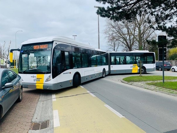 De chauffeur had de draaicirkel blijkbaar verkeerd ingeschat. Een wagen, die reglementair aan de kant stond geparkeerd, verhinderde dat de bus de keerbeweging volledig kon uitvoeren.
