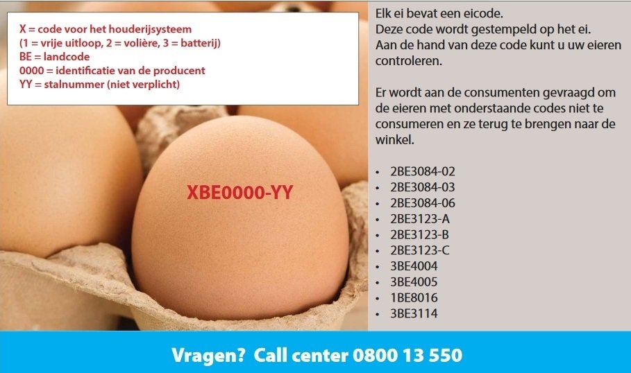 Het federaal voedselagentschap (FAVV) heeft de lotnummers verspreid van eieren die worden teruggeroepen als gevolg van de fipronil-crisis. Er wordt aan de consumenten gevraagd de eieren niet op te eten, maar om ze terug te brengen naar de winkel.