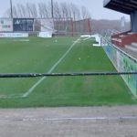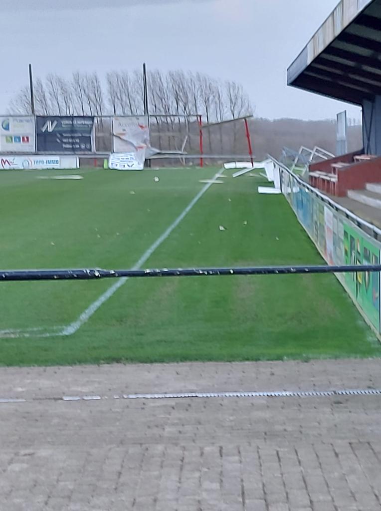 Langs voetbalveld van KFC Voorde-Appelterre blies een windvlaag het doel, reclamepanelen en -banners en een deel van de omheining weg.
