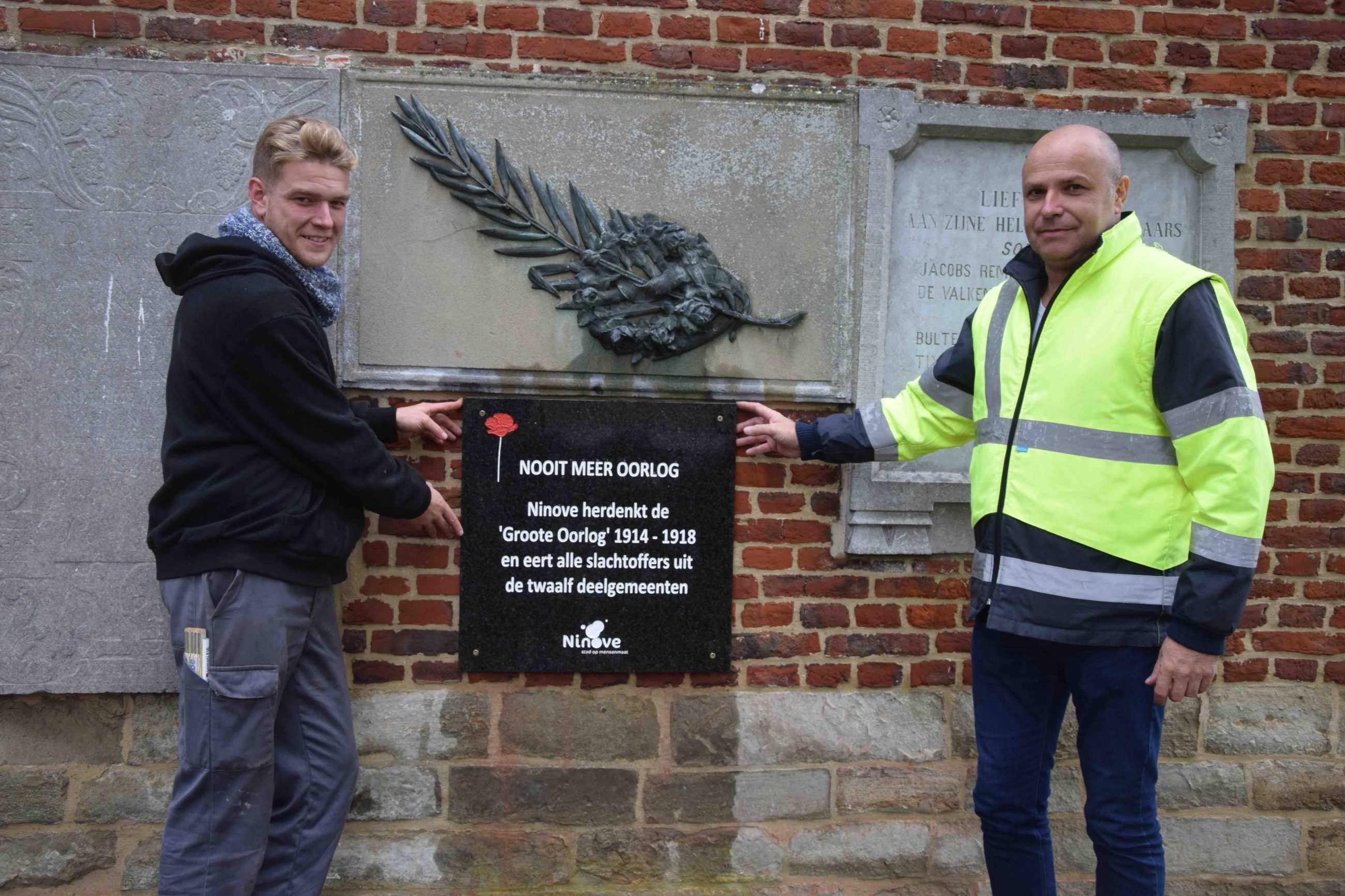 En ook op de begraafplaatsen wil de stad die boodschap uitdragen. Zo is op alle kerkhoven (hier in Lieferingen) deze week een plaat bevestigd met “Nooit meer oorlog. Ninove herdenkt de ‘Groote Oorlog’ 1914 – 1918 en eert alle slachtoffers uit de twaalf deelgemeenten” en een rode klaproos op. De begraafplaatsen zijn duidelijk klaar voor 11 november. Zo werden eerder al Belgische vlaggetjes met 1914-1918 aangebracht bij de graven van de oud-strijders.