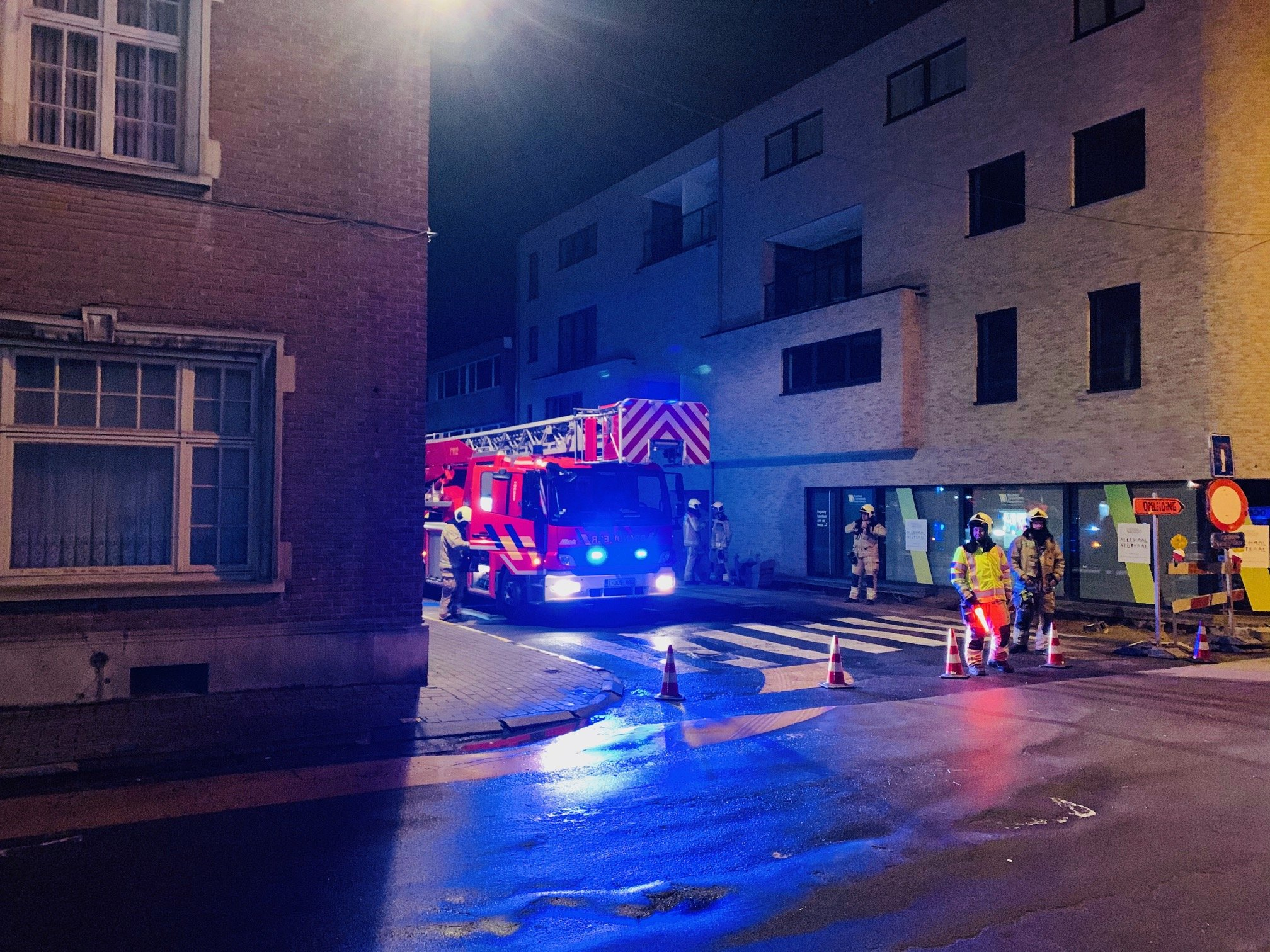 Aan aantal leien was al op de straat beland; andere waren losgekomen en dreigden ook naar beneden te vallen. De brandweer van de zone Zuid-Oost kwam snel ter plekke met de elevator. Zij namen de losliggende leien weg, beveiligden het dak en ruimden de gevallen leien op. Er vielen geen gewonden.