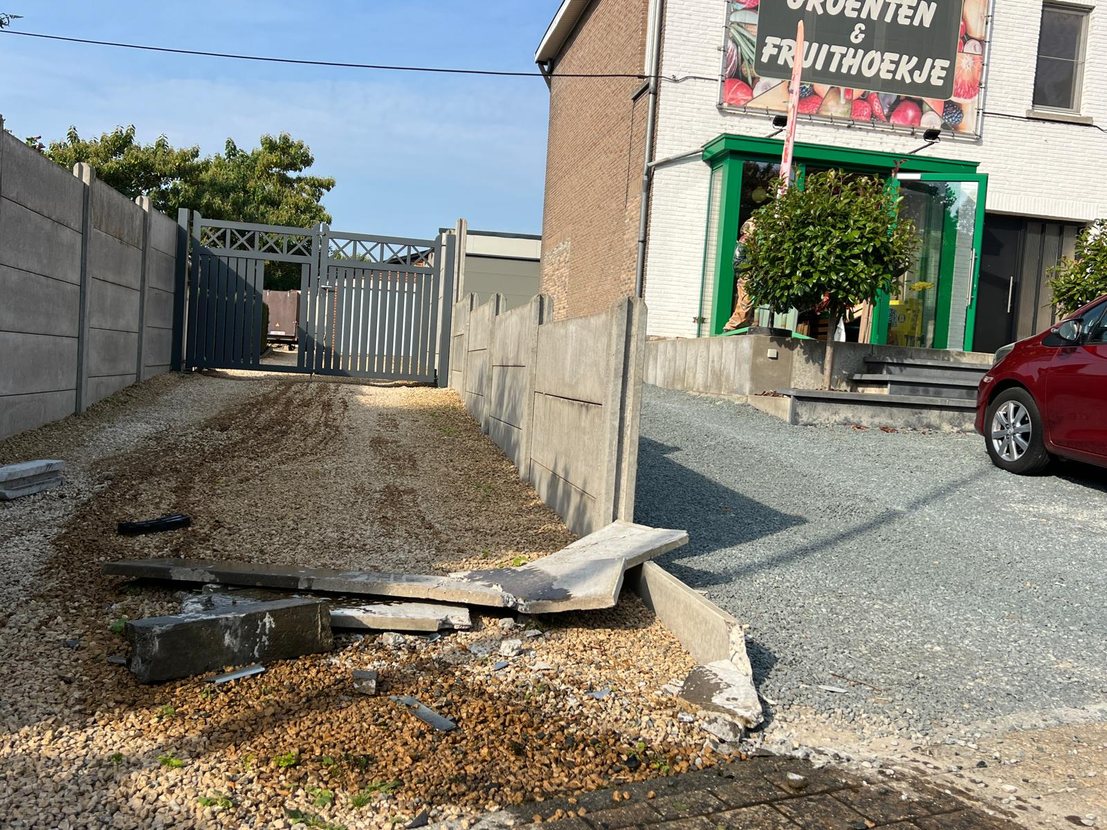 De chauffeur trachtte nog weg te rijden, maar even verder op de Edingsesteenweg begaf zijn gehavende wagen het toch. Naast de ravage aan de oprit liet hij ook een oliespoor op de weg achter.
