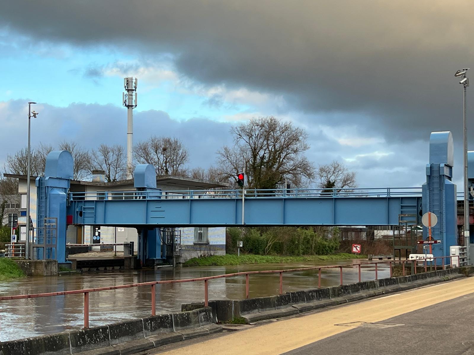 Oude Kaaibrug omhoog wegens hoge waterstand