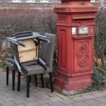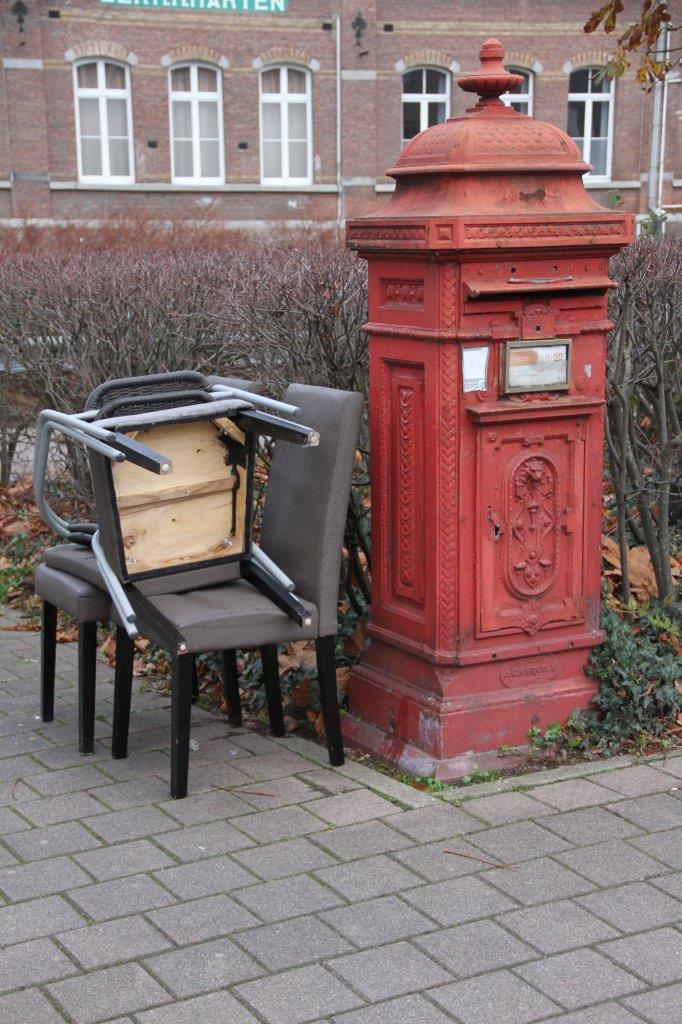 Op de splitsing van de Leo Moeremansplaats en de Burchtdam heeft iemand enkele stoelen naast de postbus geplaatst.