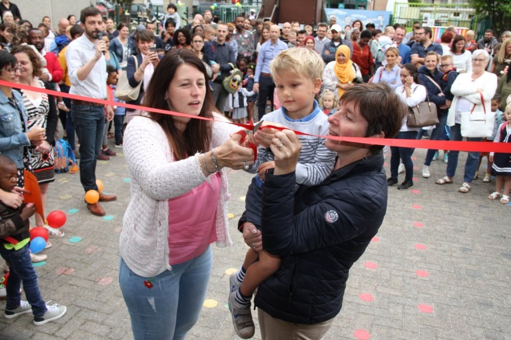 Bij de kleuters zijn de vernieuwde lokalen plechtig geopend met het doorknippen van het lint. De leerkrachten en een bellenblazenclown wachtten de kindjes eerst op. Zij moesten door een lintenpoort hun opwachting maken.