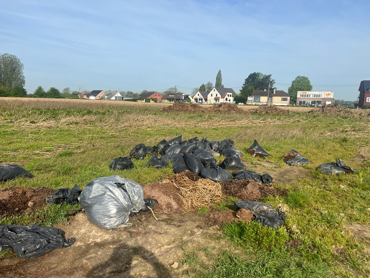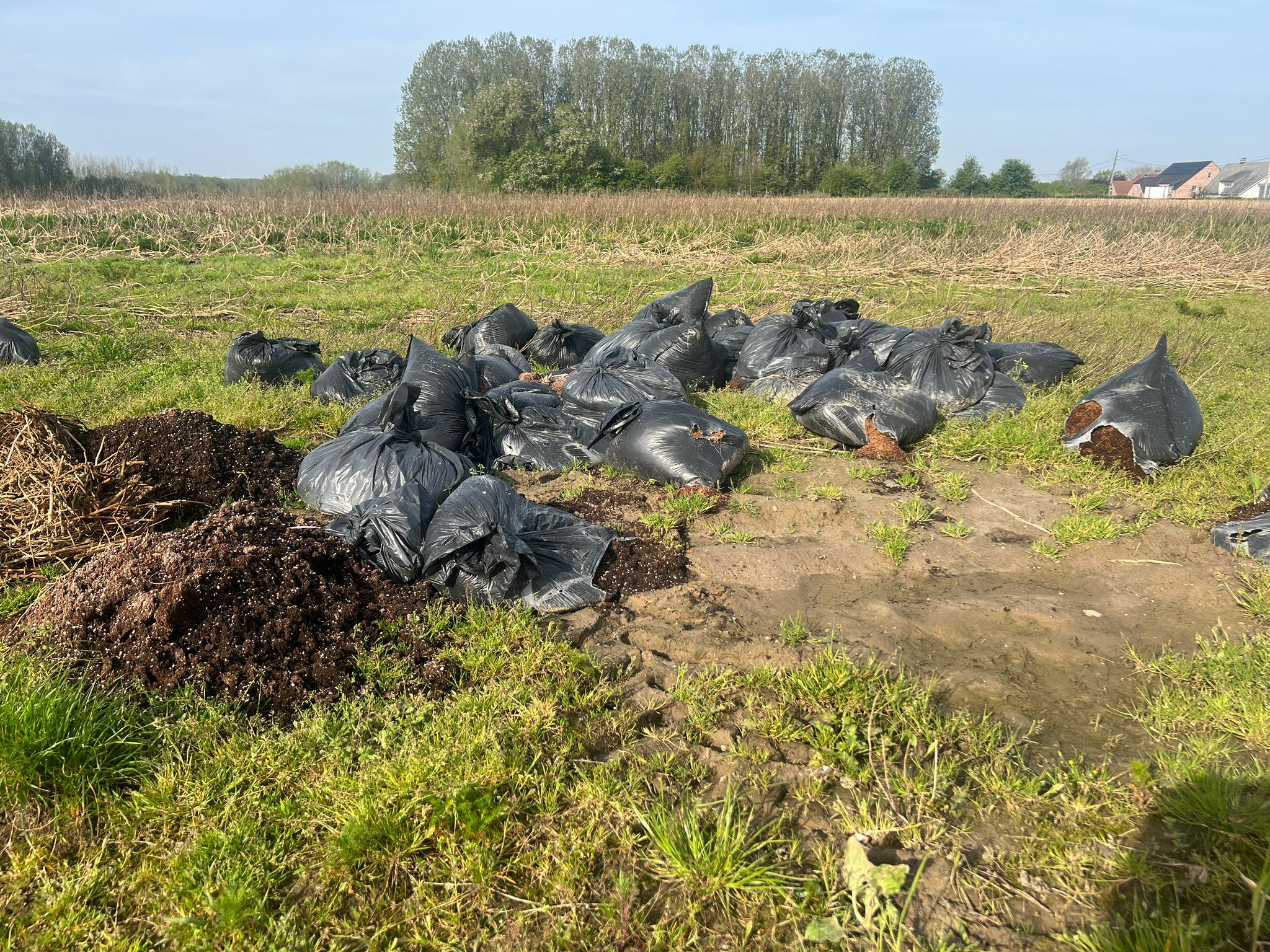 De politie heeft dat net als andere gebruikers van sociale media dus ook op die manier vernomen en kwam zaterdagochtend 13 april meteen ter plaatse. De zakken lagen verspreid op de akkers langs de veldweg en bleken ook al te zijn doorzocht, door dieren of geïnteresseerden.