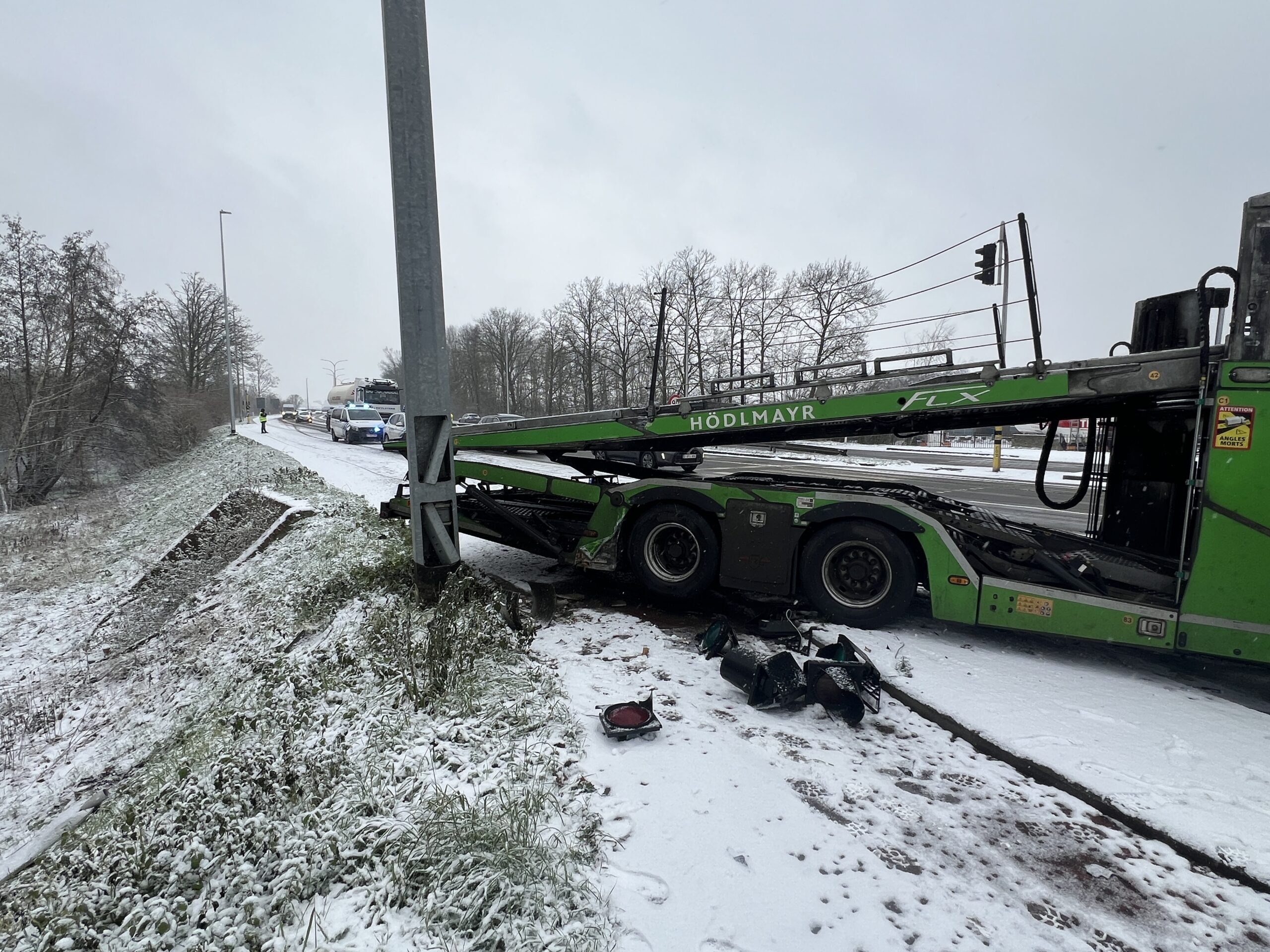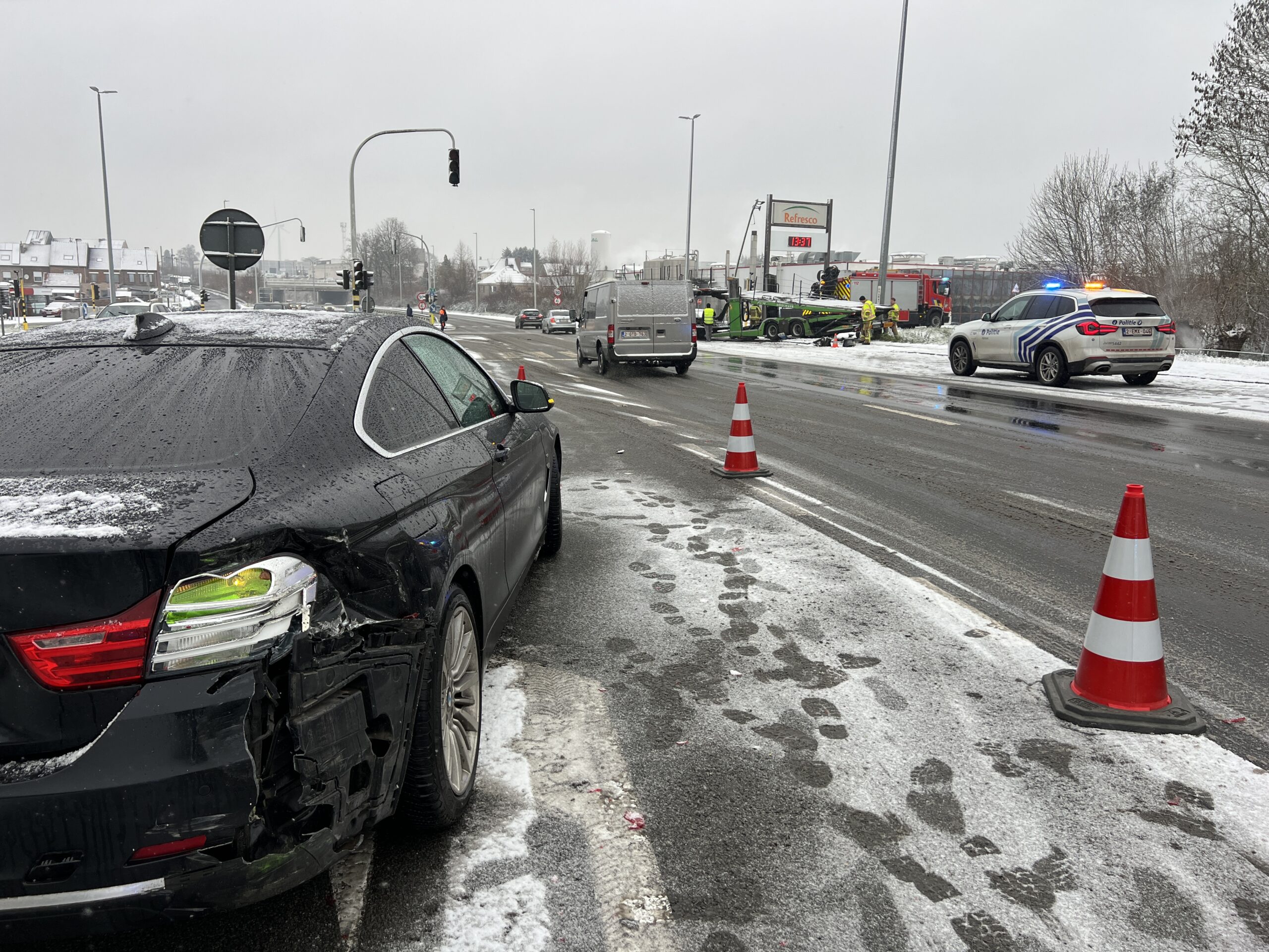 NINOVE – Een Roemeense vrachtwagen voor autotransport botste maandag 5 januari tegen een personenwagen. Niemand raakte gewond, maar de materiële schade is groot; de verkeerslichten zijn door het ongeval defect.