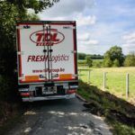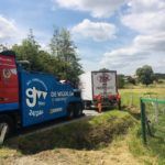 Een takelwagen zal ook nu weer de klemgereden vrachtwagen moeten bevrijden. Dat is geen sinecure op deze smalle landbouwweg.