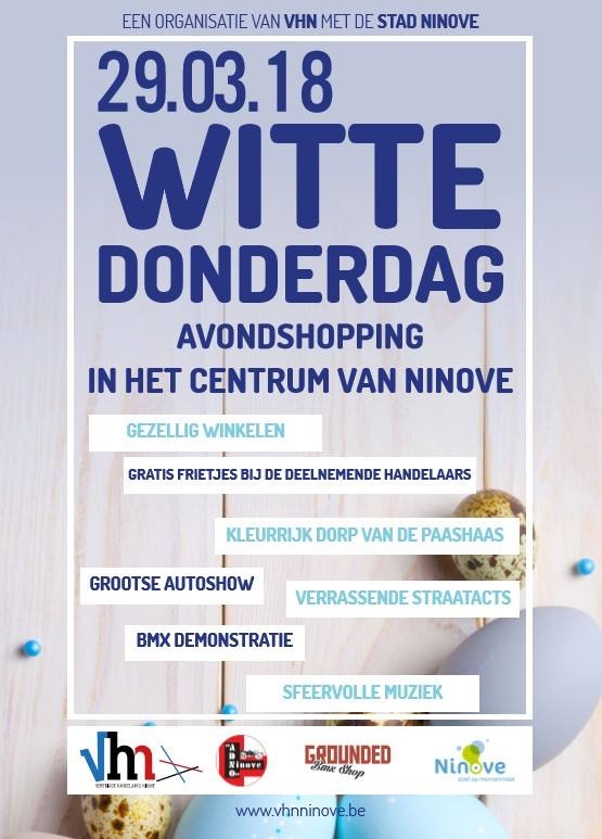 # Ninove – Vandaag donderdag 29 maart vinden er vanaf 16 uur in het centrum verschillende evenementen plaats naar aanleiding van Witte Donderdag. Er zijn BMX-demontraties, verrassende straatacts, sfeervolle muziek, een kleurrijk dorp van de paashaas en gratis frietjes bij de deelnemende handelaars. Ook ADNO is van de partij met 13 autodealers en zorgen voor een grote autoshow in de winkelstraten.