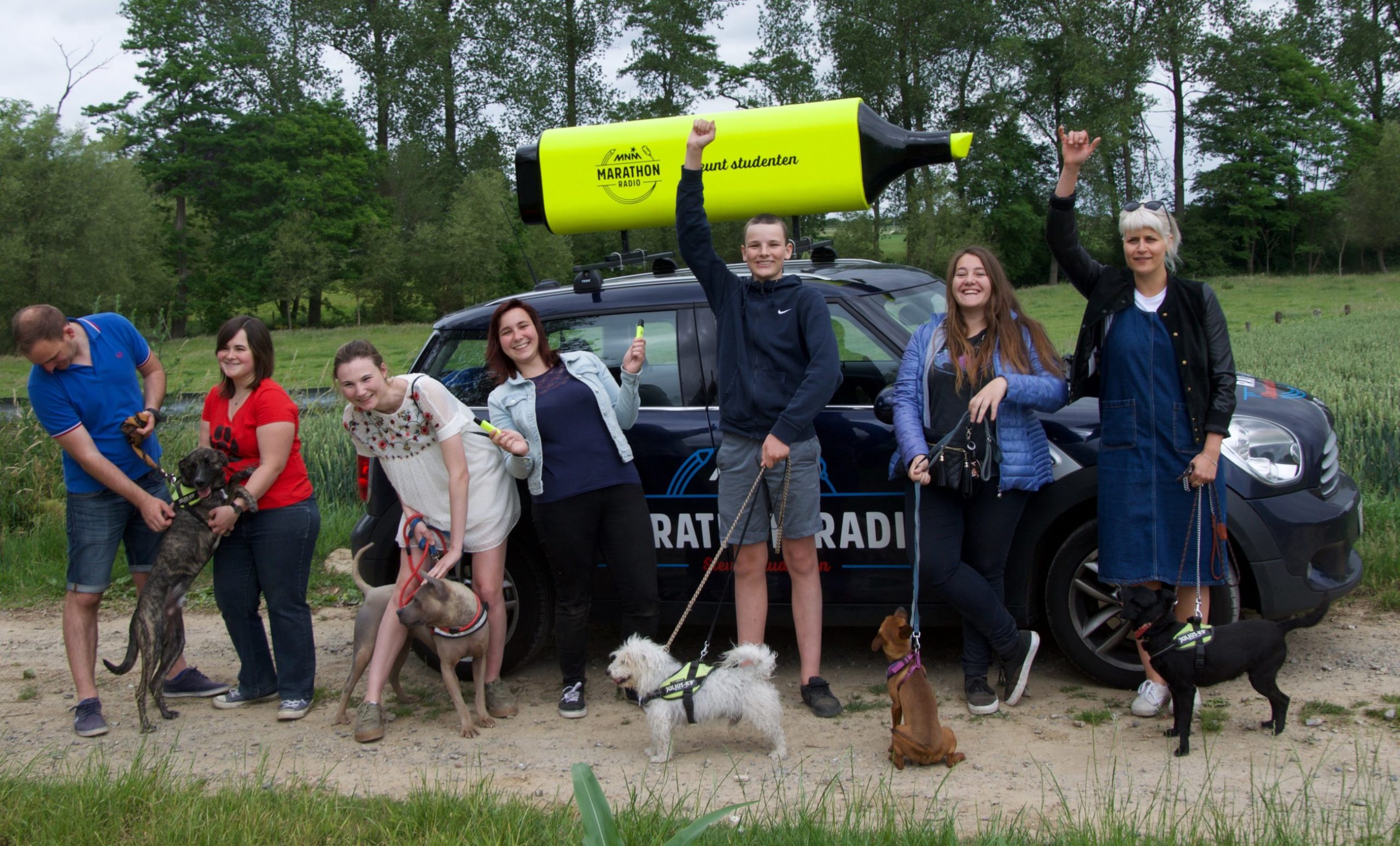 Radio-dj Eva Daeleman bracht in het kader van Marathonradio, de jaarlijkse actie van radiozender MNM om de studenten een hart onder de riem te steken tijdens de blokperiode, een bezoek aan het Dierenasiel Ninove in Denderwindeke. “We zochten acties om studenten te laten ontspannen tijdens de examens en kwamen hier uit toen we naar een asiel zochten om samen met de studenten en de hondjes te kunnen wandelen. Zo laden de studenten extra energie op om voor het volgend examen opnieuw te kunnen beginnen blokken”, vertelt Daeleman. “Ik heb hier in het asiel alleszins mijn hart verloren aan het mopshondje Bo. Ik heb zelf ook een mopshond Olaf en zou die zo mee naar huis willen nemen.” Daeleman en vijf ‘blokbeesten’, waaronder Tiffany Demeulenaere (18) en Jelke Van Hassel (24) uit Meerbeke, trokken door de ‘Winnikse’ velden voor een wandeling van zo’n half uur. “We houden beide enorm veel van dieren en eens buiten gaan om te wandelen met deze hondjes is eigenlijk de perfecte ontspanning voor tijdens of na het studeren”, lachen ze. “We zagen het bericht dat Eva naar het Dierenasiel Ninove kwam op Snapchat en hebben geen moment getwijfeld. Onbegrijpelijk hou sommigen hun dieren zomaar aan de kant van de weg kunnen achterlaten.” De studenten kregen ook nog de alom bekende gele ‘MNM Marathonradio steunt studenten’-fluostift. “Die komt altijd wel van pas”, lacht Daeleman. “Het was een fijne ervaring met de hondjes in een prachtige streek.”