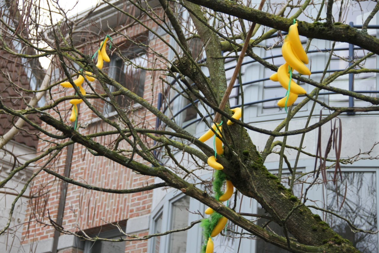Sinds enkele weken hangen er bananen in de bomen op het Oudstrijdersplein. Zijn dit de eerste tekenen van de opwarming van de aarde die zichtbaar worden in onze stad, of zou het misschien een gevolg zijn van het coronavirus ?