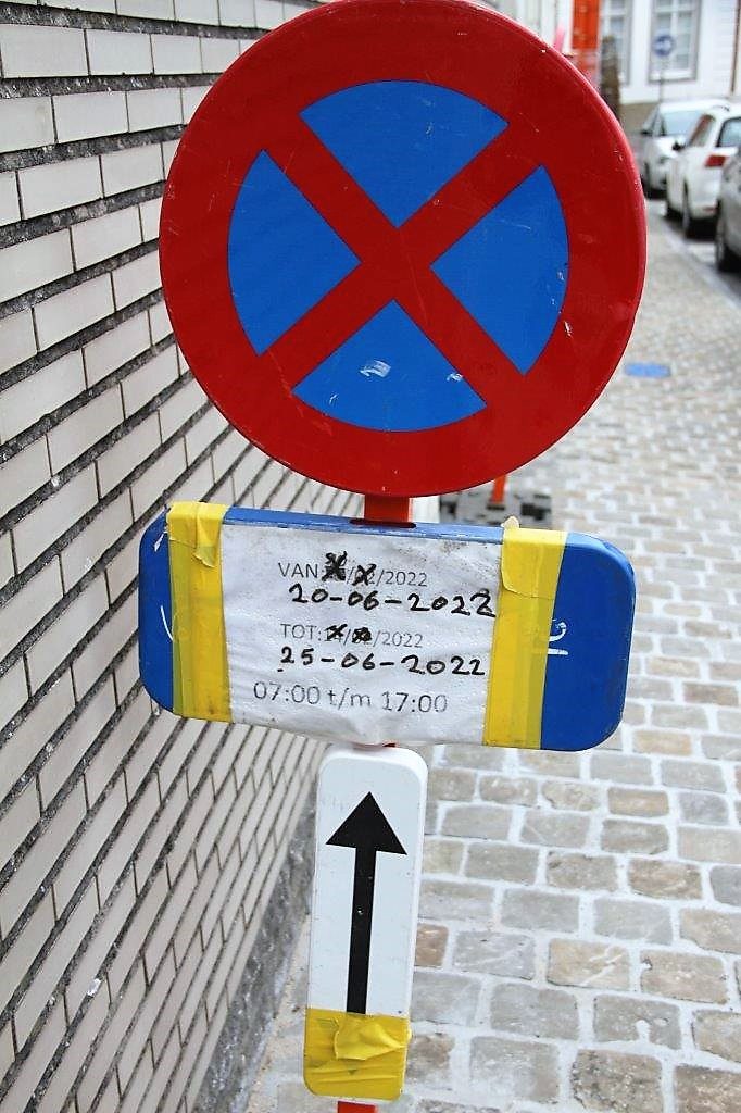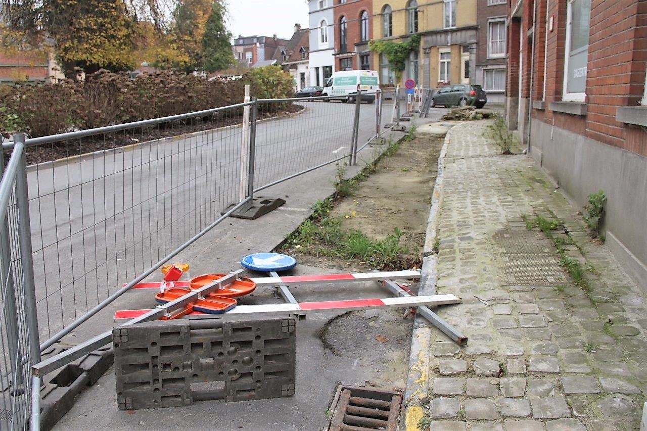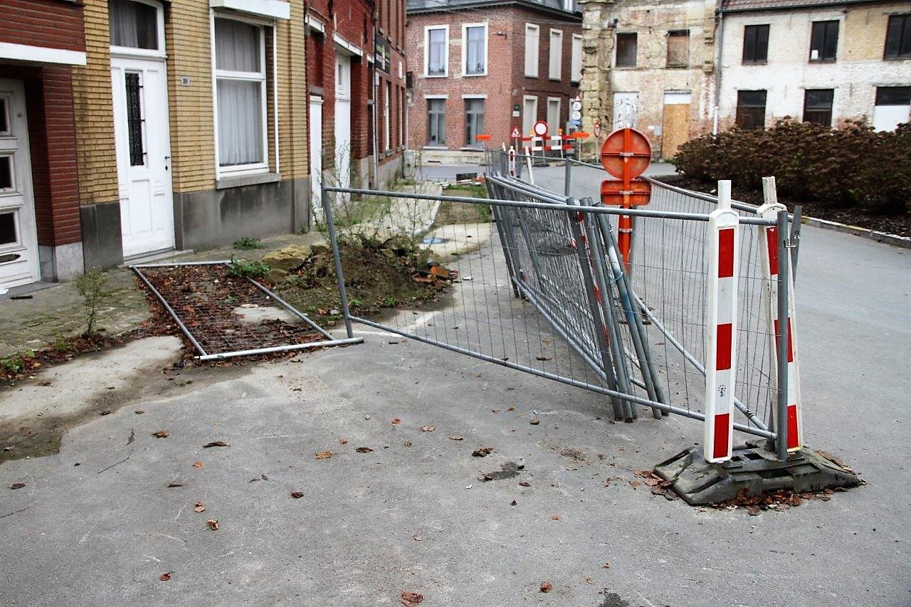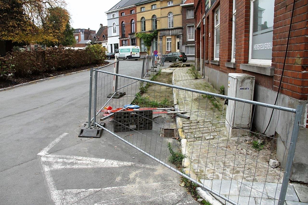 De borden met parkeerverbod van 20 tot 25 juni staan er nog steeds, de nadarafsluitingen liggen en staan rond de onafgewerkte sleuven. De signalisatie, die de werf moet afbakenen, ligt al maanden op de grond.