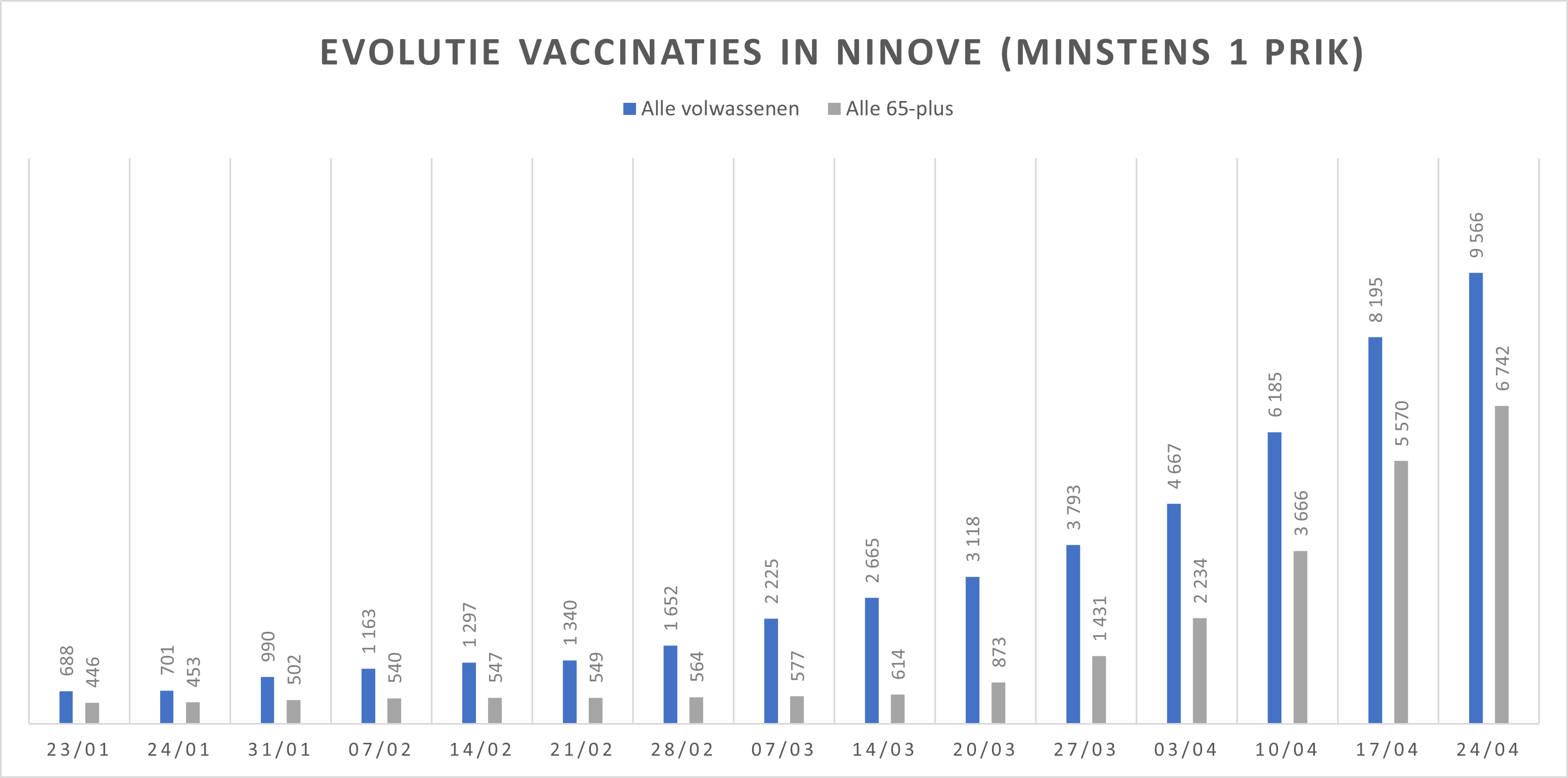NINOVE – Momenteel heeft 30,49% van de meerderjarige inwoners (9.567 personen) minstens één corona-prik gekregen. Bij de 65-plussers is dat 82,91% (6.742 personen).