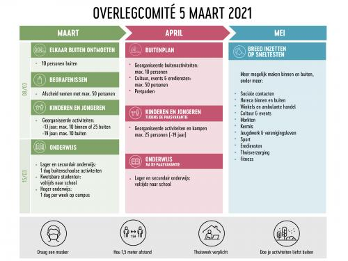 ALGEMEEN – Het Overlegcomité heeft vrijdag 05 maart verschillende versoepelingen aangekondigd. In maart en april komen de buitenactiviteiten aan bod. Indien dit goed verloopt, is vanaf mei meer mogelijk in de horeca, de cultuur- en de evenementensector.