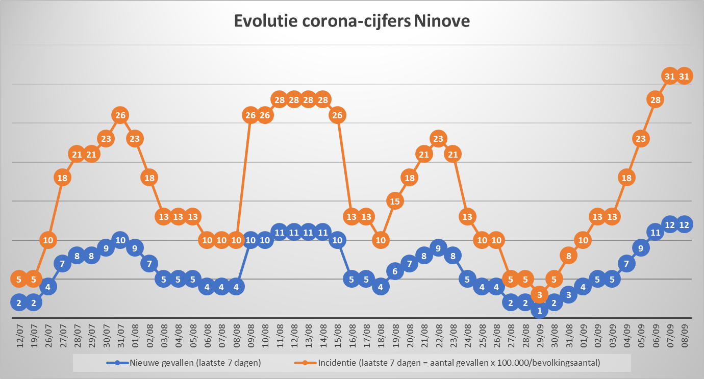 Het aantal besmettingen en de incidentie (besmettingen x 100.000/bevolkingsaantal) liggen op 08 september hoger dan eind juli, toen de strikte mondmaskerplicht is doorgevoerd en alle evenementen zijn afgelast. Toch is dit geen reden om de net ingevoerde versoepelingen op de beide vlakken terug te draaien.