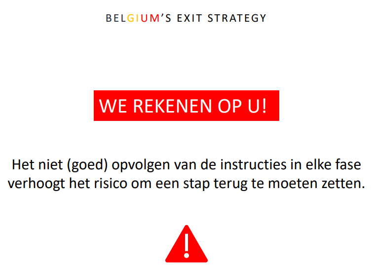 De strikte inperkingsmaatregelen van 12 maart en daaropvolgend blijven zeker van kracht tot en met 3 mei. Daarna zou België kunnen beginnen met de afbouw van de maatregelen, als de omstandigheden het toelaten.