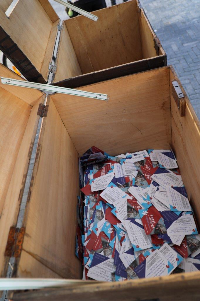 De marktkramers boden hun klanten de afgelopen 4 weken bij een aankoop een wedstrijdformulier aan. Dat konden ze ingevuld deponeren in de wedstrijdbus.