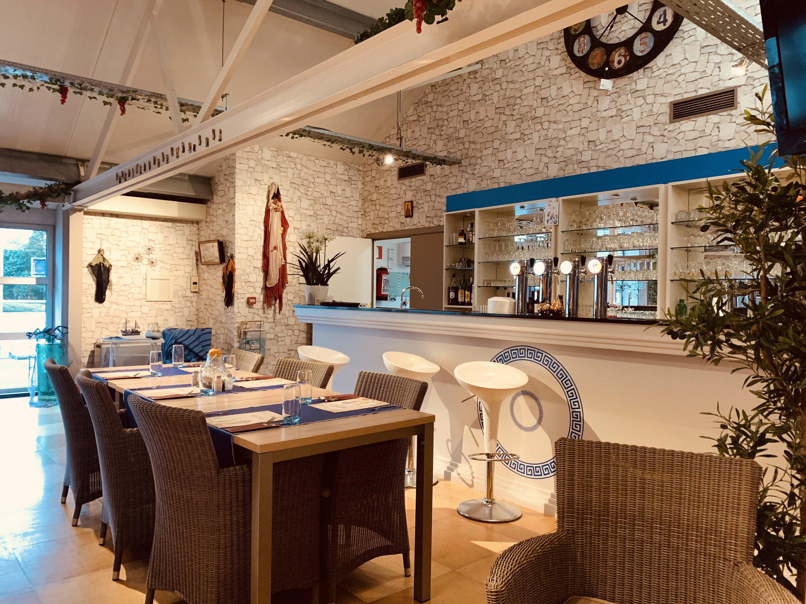 De ingang van het Griekse restaurant bevindt zich aan de Tombergstraat 1 in Roosdaal een zijstraat aan de Ninoofsesteenweg.