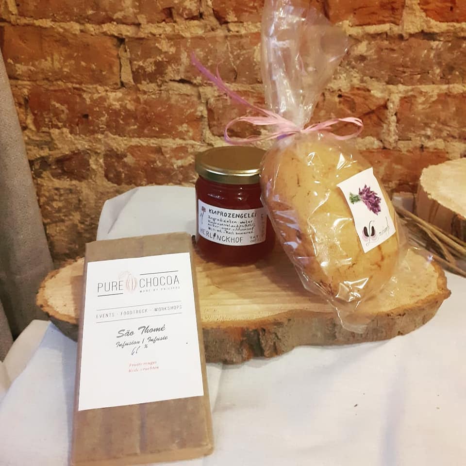 De planken bevatten delicatessen van Herlinckhof zelf en van 3 andere ambachtelijke makers uit de streek: Pure Chocoa (Schepdaal), Den Dael (Kester) en Olefació (Lebbeke).