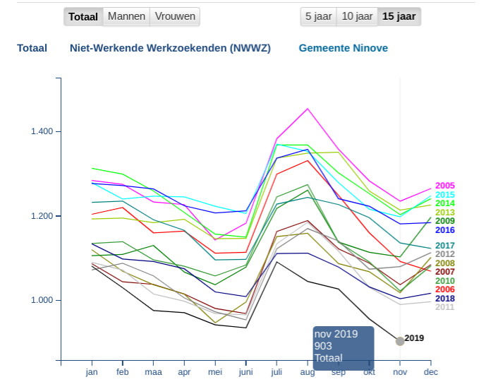 Afgelopen maand telde Ninove in totaal 903 werkzoekenden of 4,9% van de beroepsbevolking. Dat is een daling met 10% ten opzichte van vorig jaar. In vergelijking met vorige maand zijn er 5,5% minder werklozen. 2019 zit al het ganse jaar op recordkoers. Sinds augustus is de daling explicieter. Er is een opvallende afneming van het aantal werklozen bij de 55+. Dit kan wijzen op een strenger activeringsbeleid in deze leeftijdscategorie.