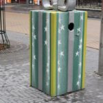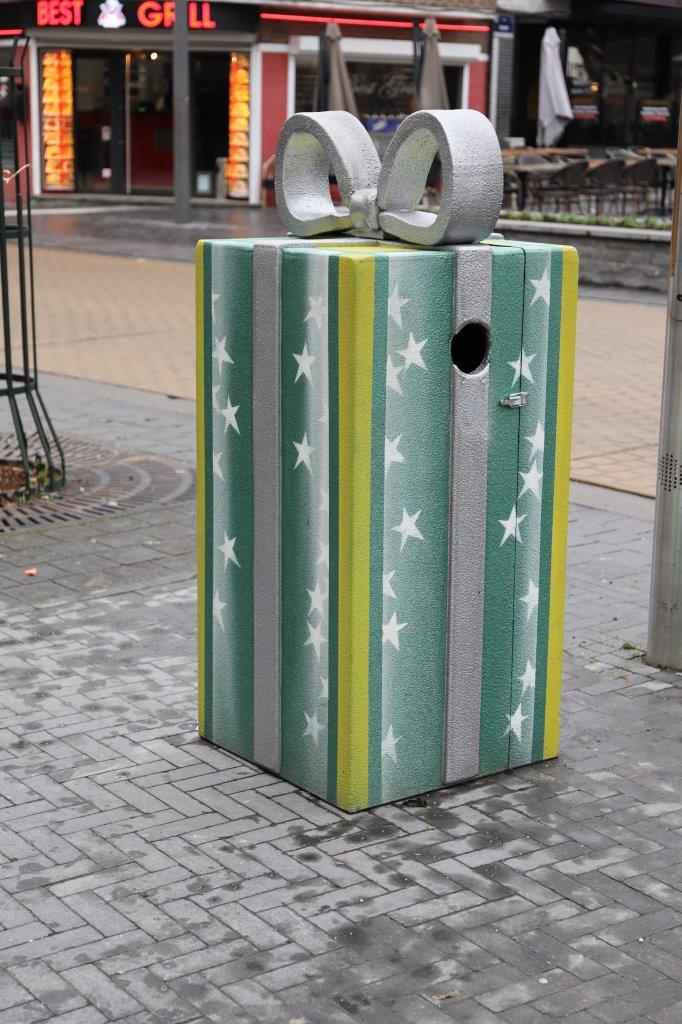 De vuilnisbakken in de winkelstraten zijn aangekleed als een geschenkje, net iets gezelliger dan een groene vuilnisbak.