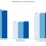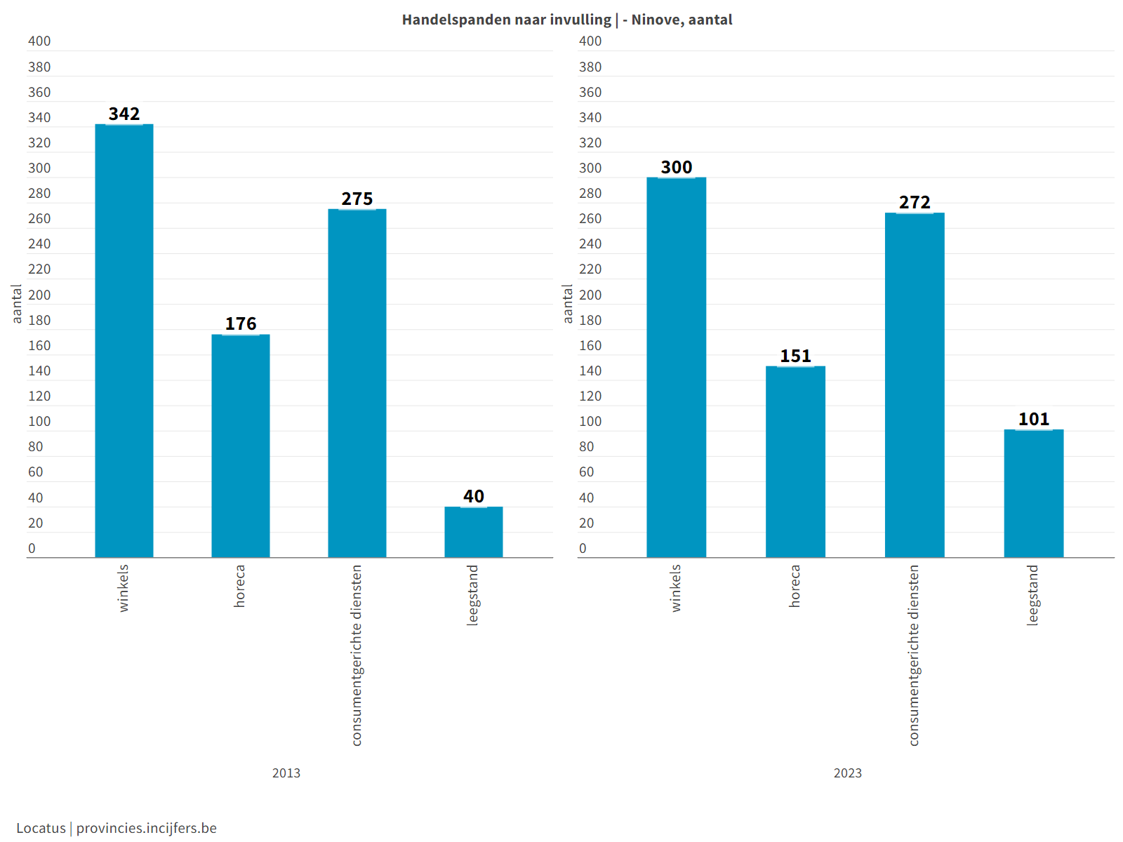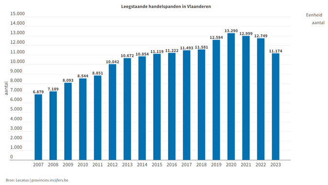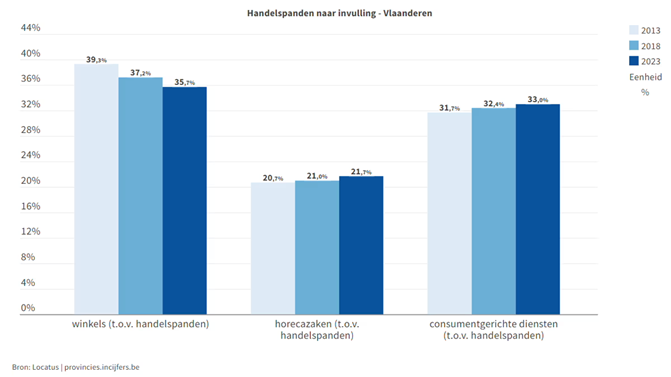 Tussen 2013 en 2023 nam het aantal winkels in Vlaanderen af met 17,3 %. In 2013 was in 39,3 % van de handelspanden een winkel gevestigd, in 2023 nog in 35,7 %. Die daling werd gecompenseerd door méér horecazaken (21,7 %) en méér consumentgerichte diensten (33 %) in de handelspanden, hoewel ook deze sectoren in absolute cijfers erop achteruit zijn gegaan met respectievelijk 4,7 % en 5,5 %.