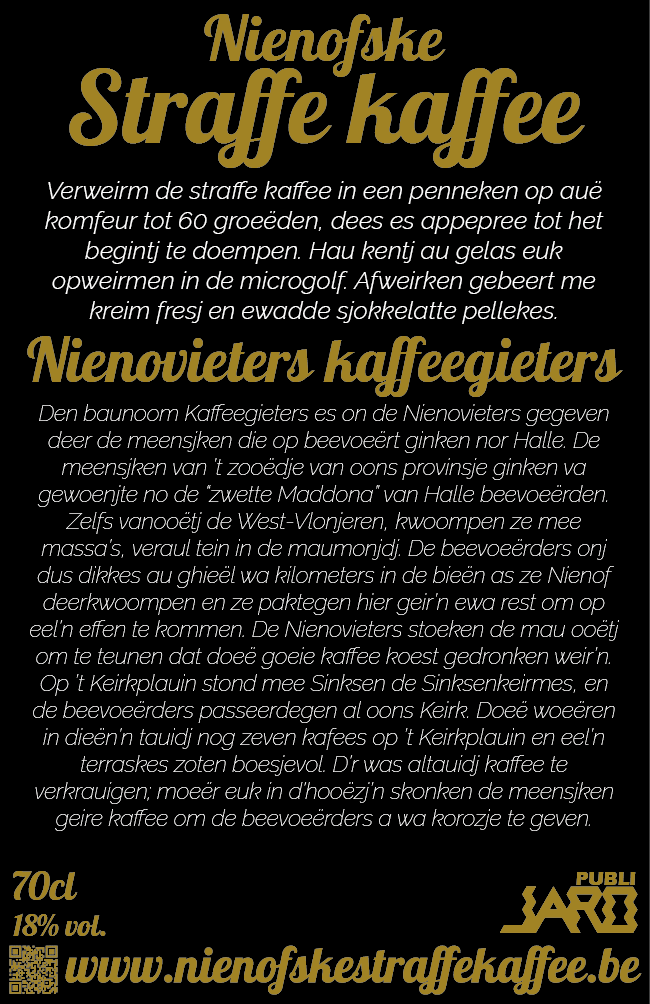 De flessen (70 cl, 18 %) kosten € 23. “Je kunt ze bestellen via onze webshop. We leveren binnen Ninove gratis aan huis. Zodra de horeca terug open mag, zul je een Nienofske Straffe Kaffee ook in enkele cafés kunnen drinken.”