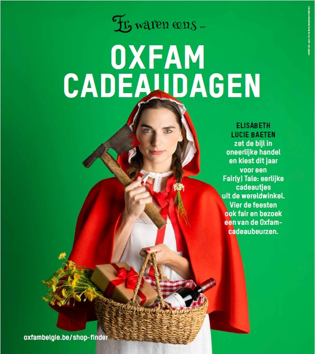 Dit jaar zetten 3 bekende Vlamingen hun schouders onder de campagne ‘Sprookjes’ ofte ‘Fair(y) Tales’. Elizabeth Lucie Baeten (Roodkapje), Jonas Geirnaert (Robin Hood) en Leah Thijs (Sneeuwwitje) kiezen resoluut voor eerlijke cadeautjes en zijn gefotografeerd door Lieve Blancquaert.