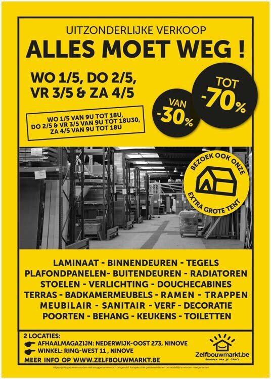 NINOVE – Zelfbouwmarkt organiseert van 1 tot en met 4 mei een stockverkoop in de winkel en een extra grote tent aan de Ring-West.
