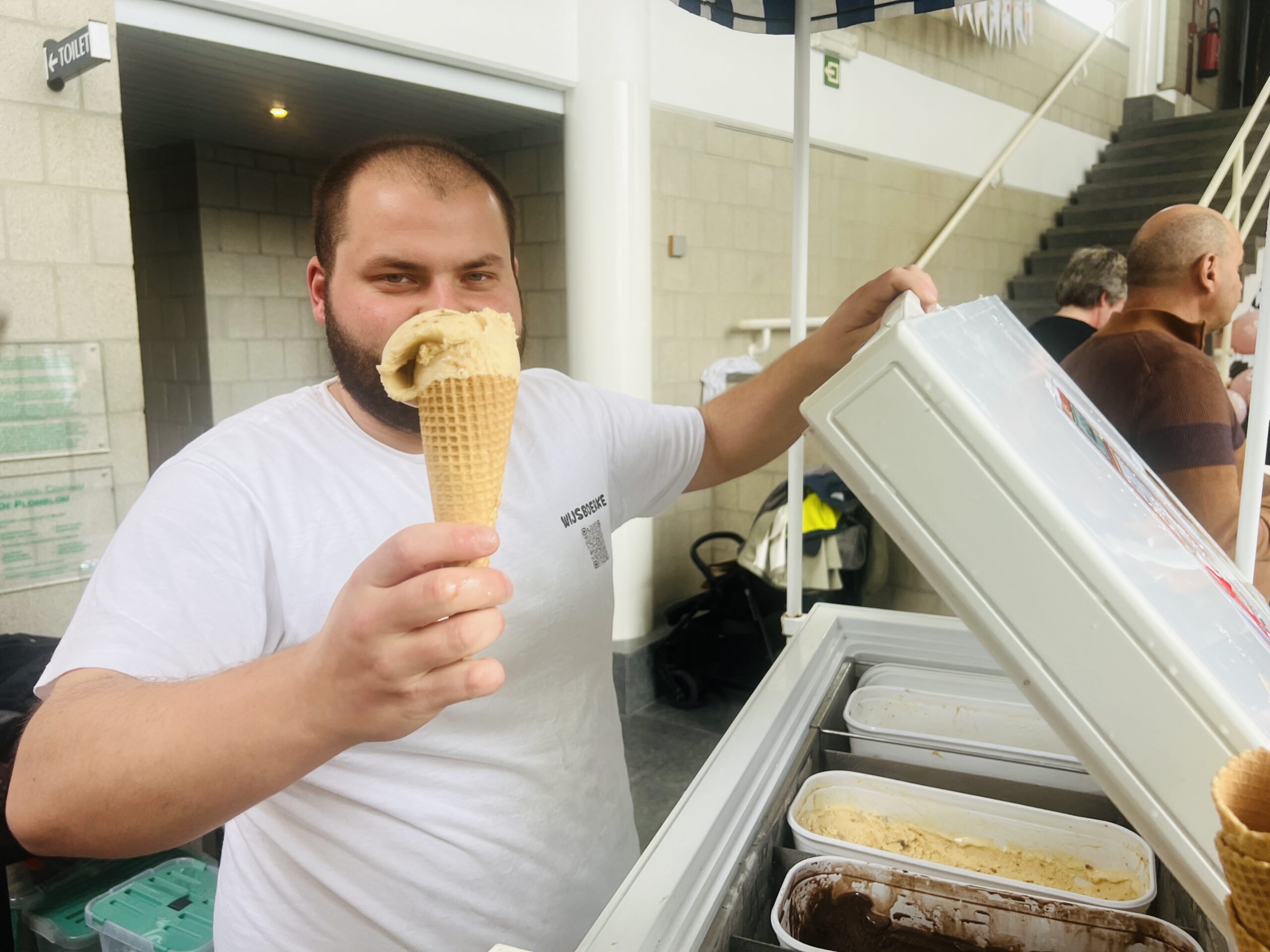 Ward vond niet direct een geschikte locatie in Ninove. “Maar mijn vader en grootouders zijn van Onze-Lieve-Vrouw-Lombeek en dus ben ik bij de eigenaars van de zaak aan de Zepposmolen gaan luisteren of de zaal vrij was deze zomer. Gedurende 6 weken kan ik er mijn ijs verkopen.”