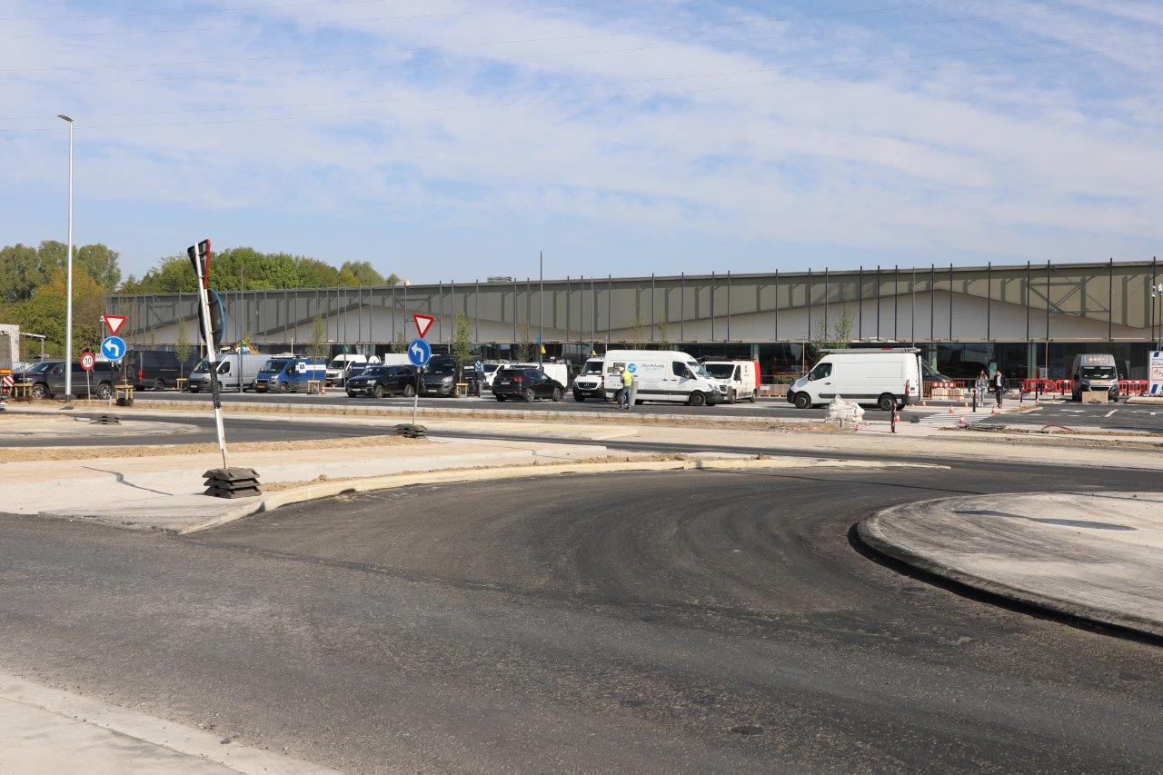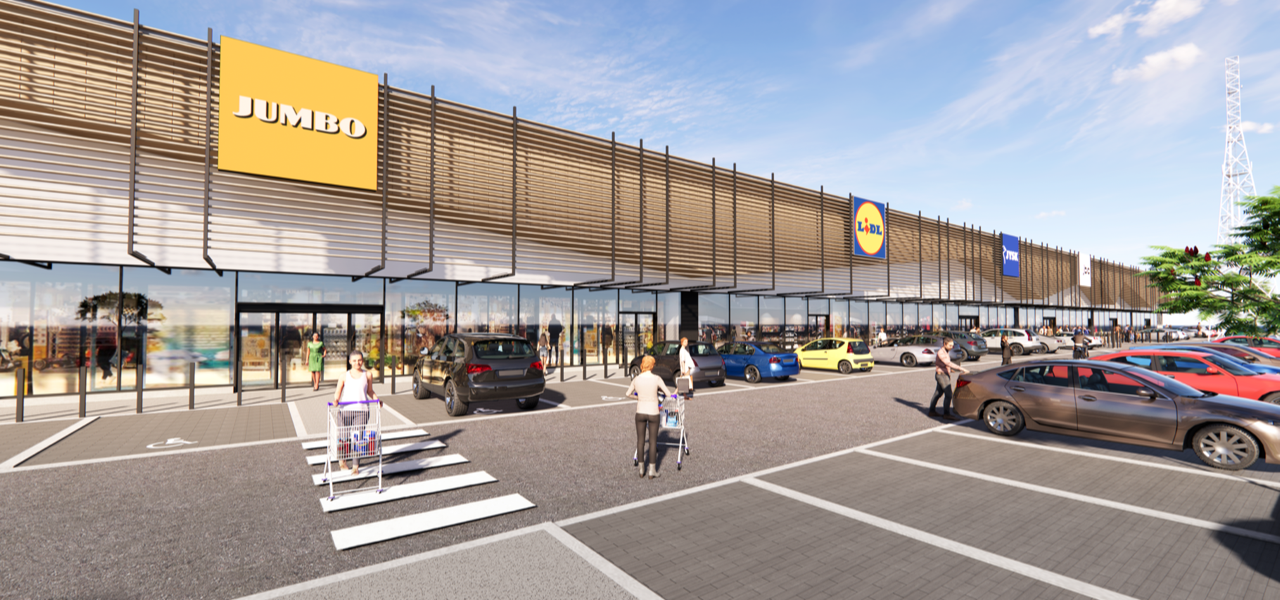 De ruwbouw, de parking en de beplanting zijn reeds afgewerkt. Momenteel zijn de inrichtingswerken van de verschillende winkelpanden aan de gang. Er zullen 6 winkels zijn gevestigd: de Nederlandse supermarktketen Jumbo, Lidl, Jysk (een Deense keten van meubelen en decoratie), schoenen en kledij Molders, JBC en tuinmeubelen Exterioo.