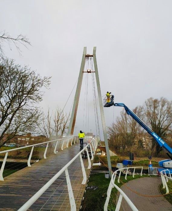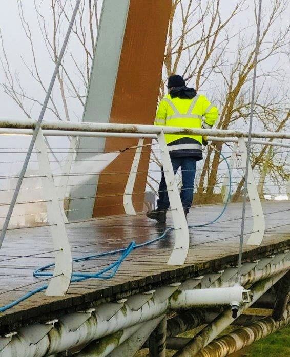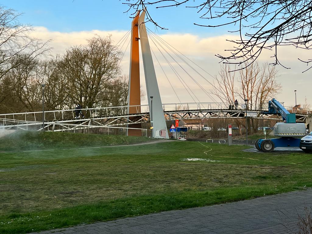 NINOVE – In opdracht van de stad geeft een firma de voetgangersbrug momenteel een grondige poetsbeurt.