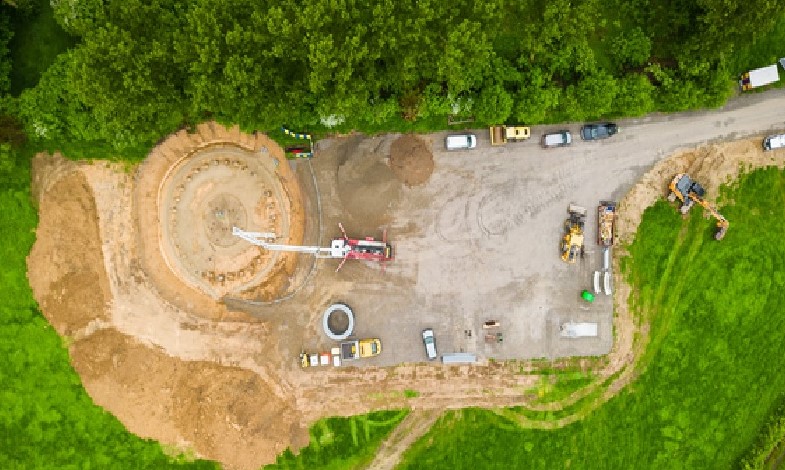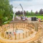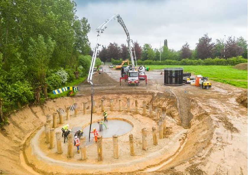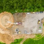 In de mei zijn de funderingspalen in de grond gezet voor de windturbine ten noorden van bedrijventerrein Doorn-Noord. Daarna kon de sokkel in beton worden aangelegd.